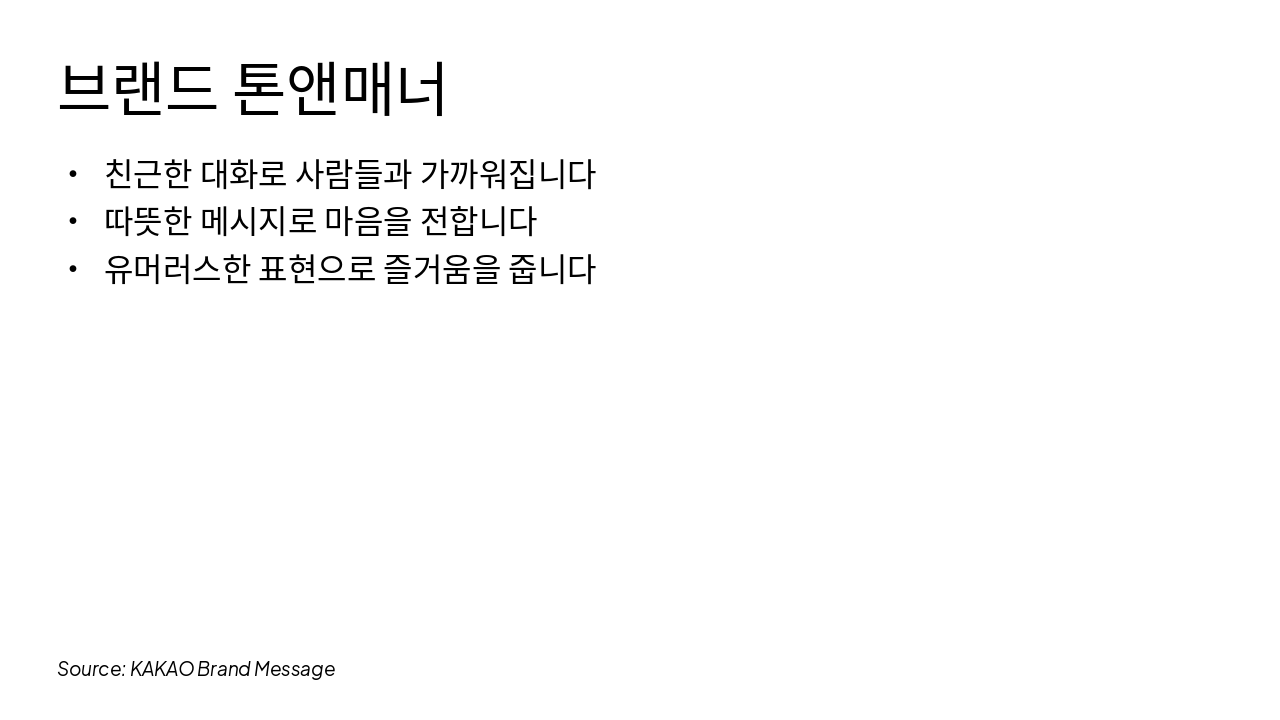 브랜드 톤앤매너는 친근한 대화로 사람들과 가까워지며, 따뜻한 메시지로 마음을 전합니다. 또한 유머러스한 표현으로 즐거움을 줍니다.