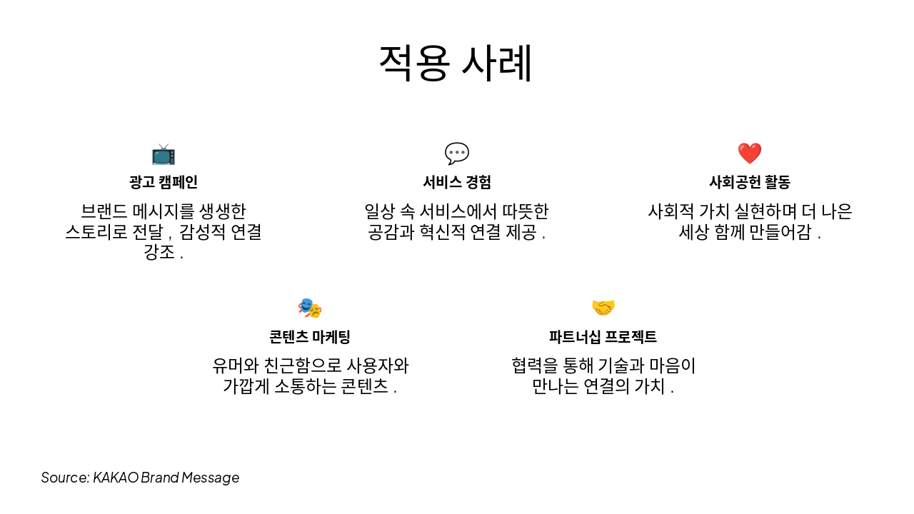 이 슬라이드는 "적용 사례"를 주제로 한 기능 그리드 형식으로, 광고 캠페인부터 사회공헌 활동, 콘텐츠 마케팅 등 다양한 사례를 아이콘과 함께 소개합니다. 각 사례는 브랜드 메시지 전달, 공감 제공, 사회적 가치 실현, 유머 소통, 파트너십 연결 등의 특징을 강조합니다.
