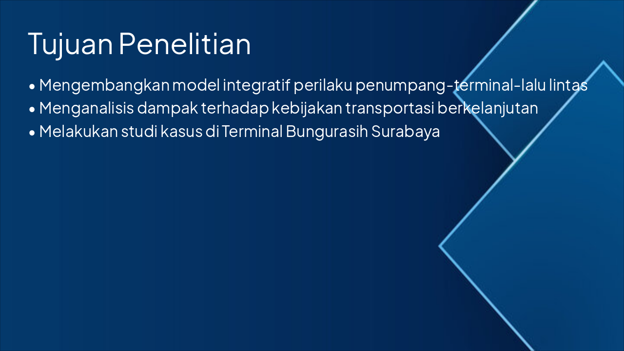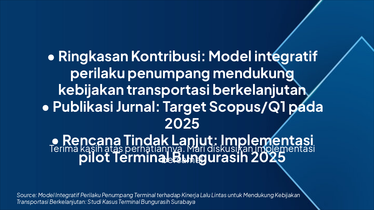 This title slide features a research presentation on an integrative model of terminal passenger behavior's impact on traffic performance to support sustainable transportation policies, using Terminal Bungurasih Surabaya as a case study. The subtitle credits the researcher, promoters, and university.