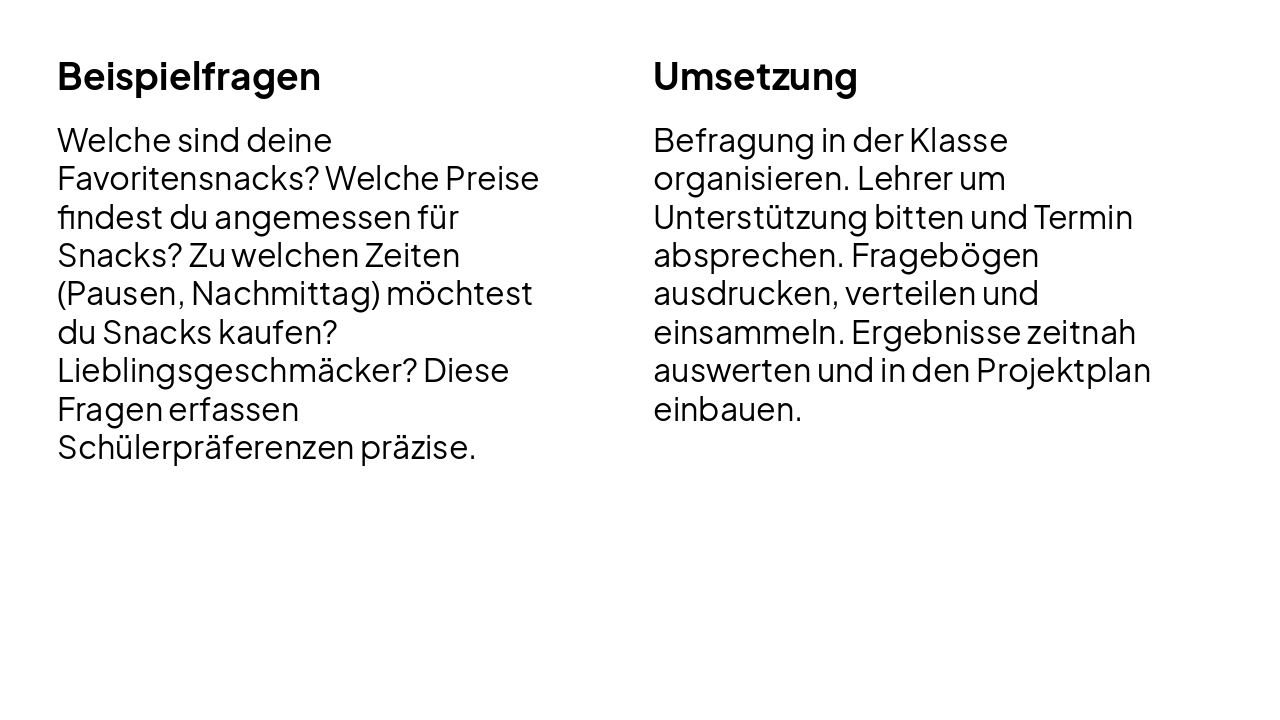 Beispielfragen Welche sind deine Favoritensnacks? Welche Preise findest du angemessen für Snacks? Zu welchen Zeiten (Pausen, Nachmittag) möchtest du Snacks kaufen? Lieblingsgeschmäcker? Diese Fragen erfassen Schülerpräferenzen präzise.
