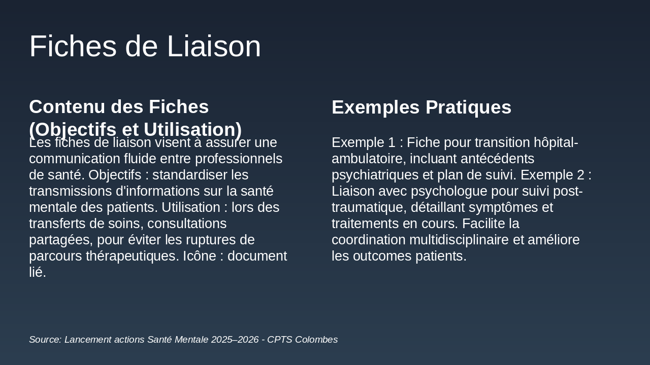 - Fiches de liaison et Prévention : Outils pratiques