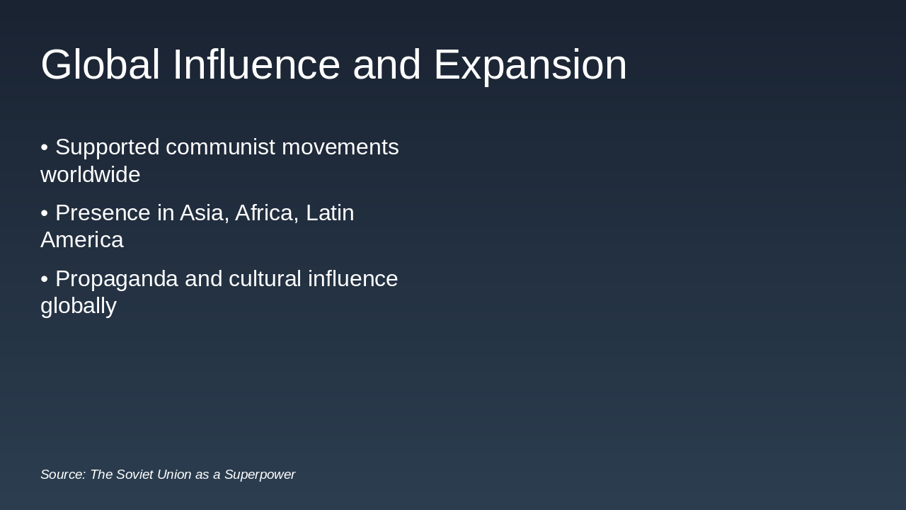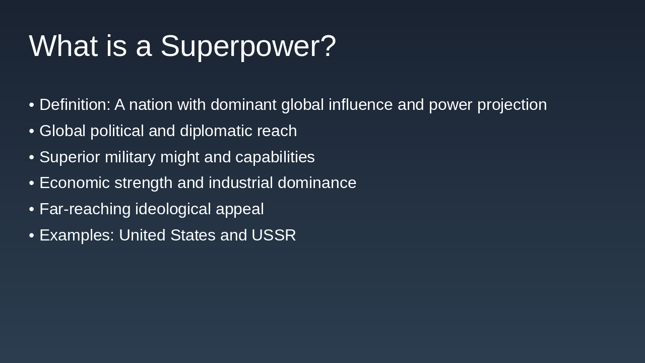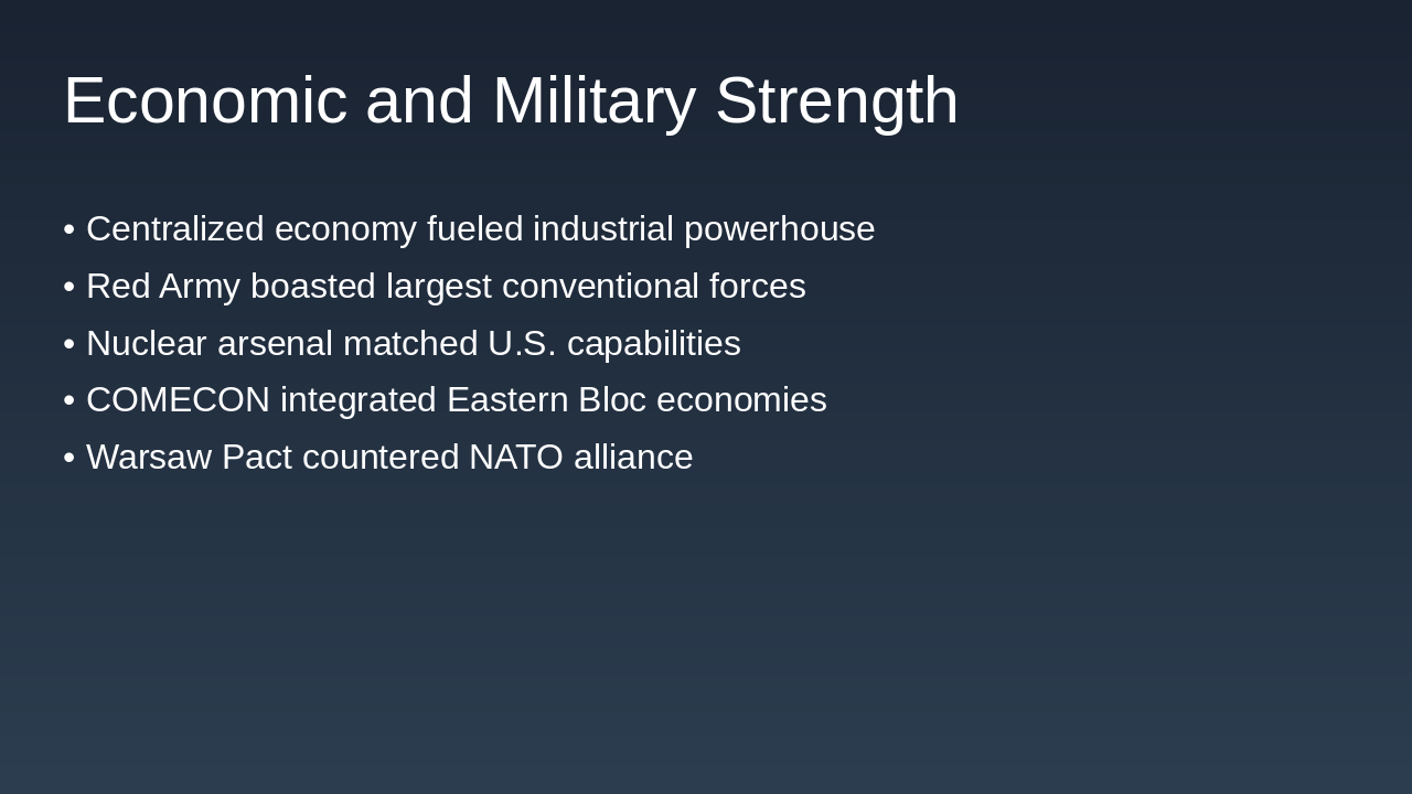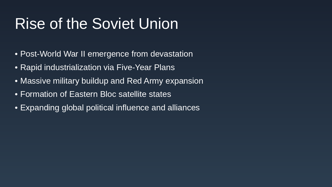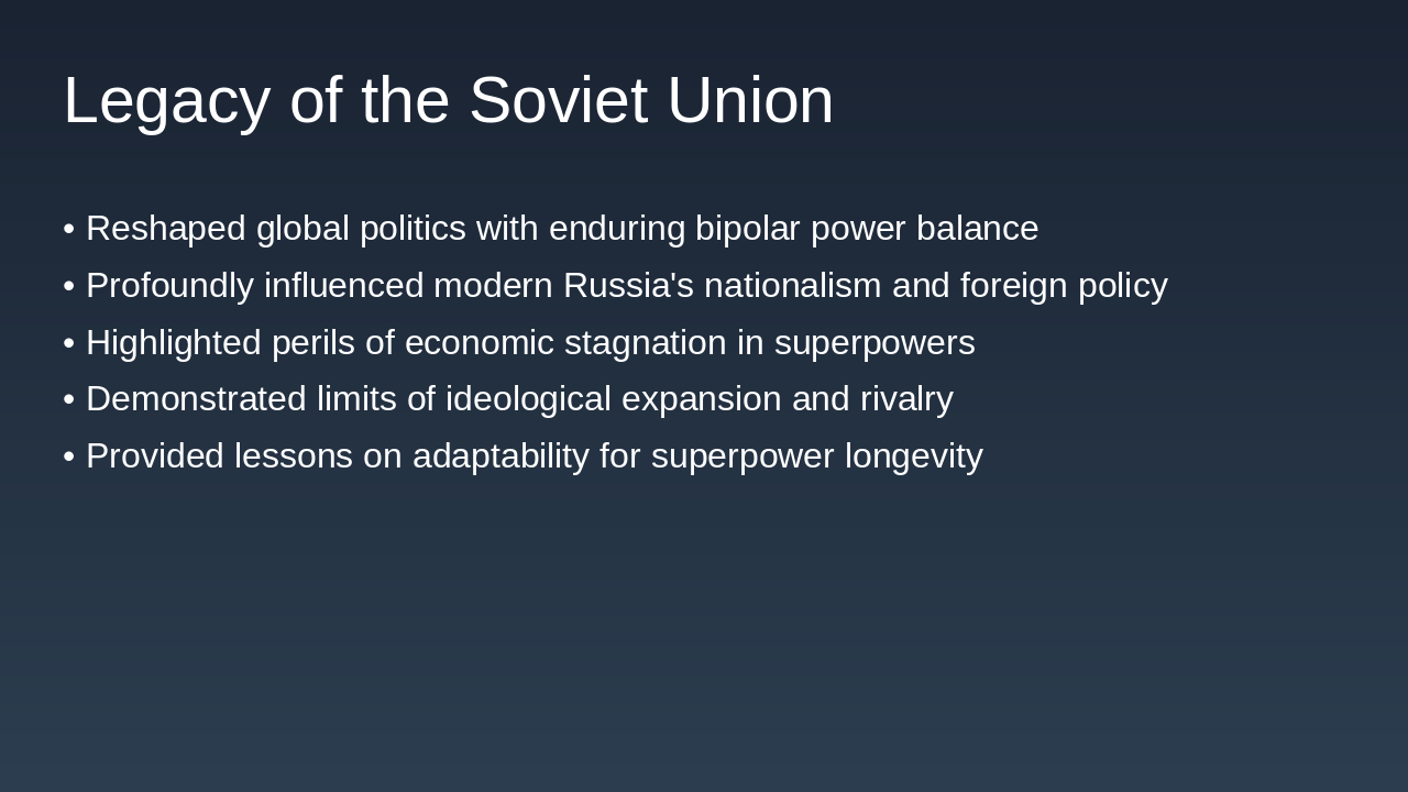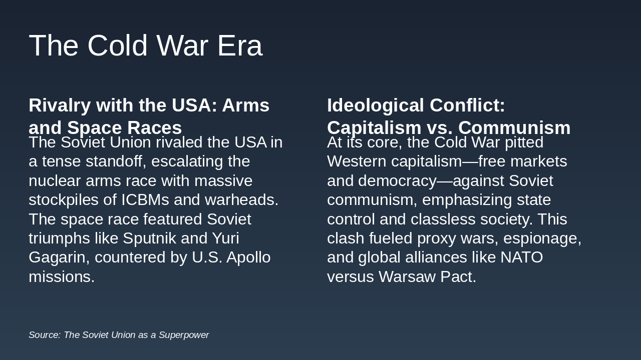 1970s: Era of Stagnation Economic slowdown and political unrest under Brezhnev. 1985: Gorbachev's Perestroika and Glasnost Reforms for economic restructuring and political openness introduced. 1989: Fall of the Berlin Wall Symbolic collapse of Iron Curtain and East-West divisions. 1991: Soviet Union Collapses USSR dissolves into 15 independent republics, ending superpower status.