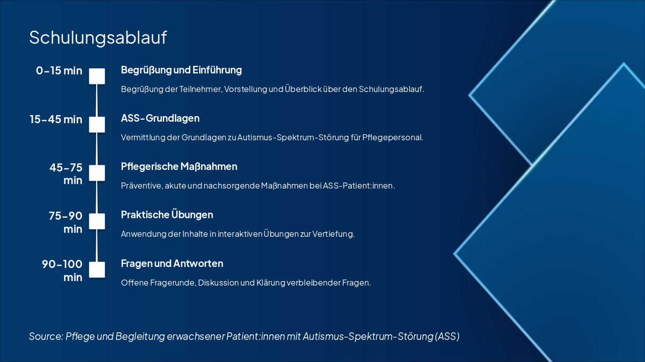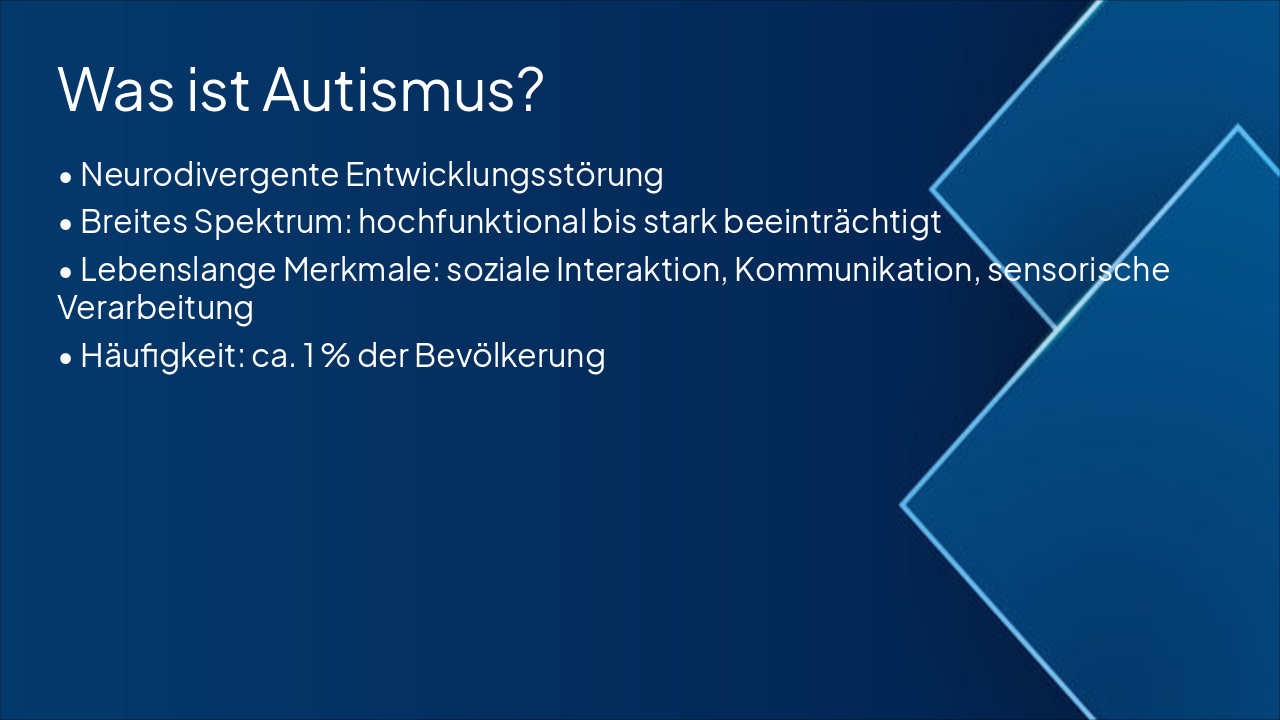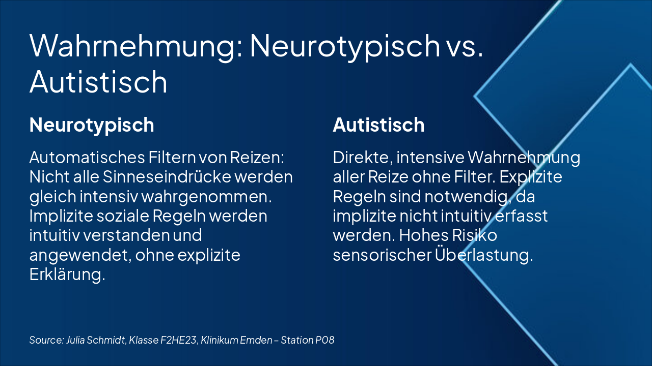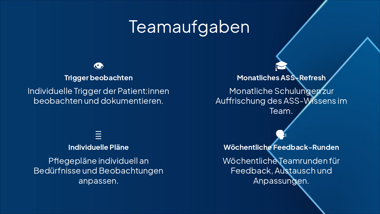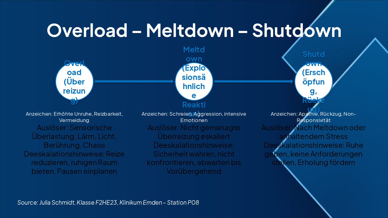 { "headers": [ "Phase", "Anzeichen", "Auslöser", "Deeskalationshinweise" ], "rows": [ [ "Overload (Überreizung)", "Erhöhte Unruhe, Reizbarkeit, Vermeidung", "Sensorische Überlastung: Lärm, Licht, Berührung, Chaos", "Reize reduzieren, ruhigen Raum bieten, Pausen einplanen" ], [ "Meltdown (Explosionsähnliche Reaktion)", "Schreien, Aggression, intensive Emotionen", "Nicht gemanagte Überreizung eskaliert", "Sicherheit wahren, nicht konfrontieren, abwarten bis Vorübergehend" ], [ "Shutdown (Erschöpfung, Rückzug)", "Apathie, Rückzug, Non-Responsivität", "Nach Meltdown oder anhaltendem Stress", "Ruhe geben, keine Anforderungen stellen, Erholung fördern" ] ] }