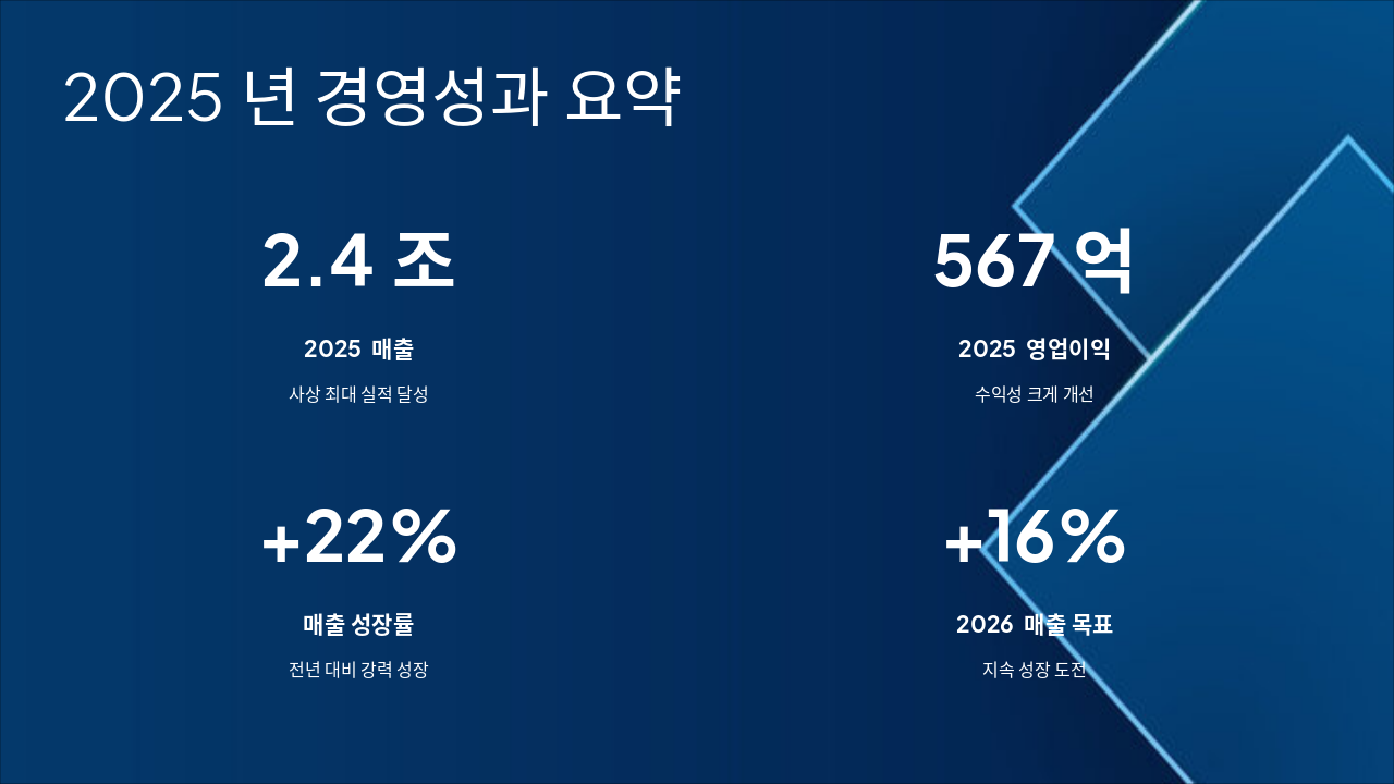 2025년 매출 2.4조 원으로 사상 최대 실적을 달성하고 영업이익 567억 원으로 수익성이 크게 개선되었습니다. 매출 성장률 +22%를 기록하며 2026년 매출 목표 +16%로 지속 성장을 도전합니다.