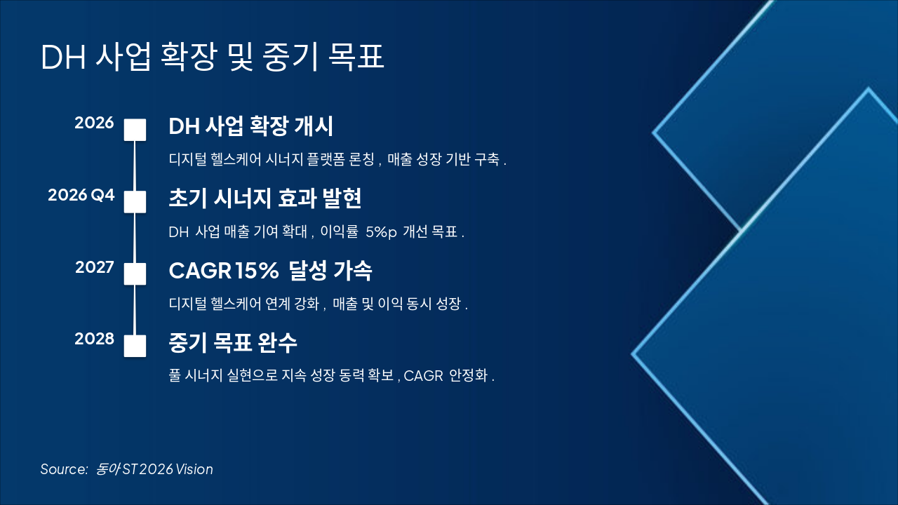 2026: DH사업 확장 개시 디지털 헬스케어 시너지 플랫폼 론칭, 매출 성장 기반 구축. 2026 Q4: 초기 시너지 효과 발현 DH 사업 매출 기여 확대, 이익률 5%p 개선 목표. 2027: CAGR 15% 달성 가속 디지털 헬스케어 연계 강화, 매출 및 이익 동시 성장. 2028: 중기 목표 완수 풀 시너지 실현으로 지속 성장 동력 확보, CAGR 안정화.