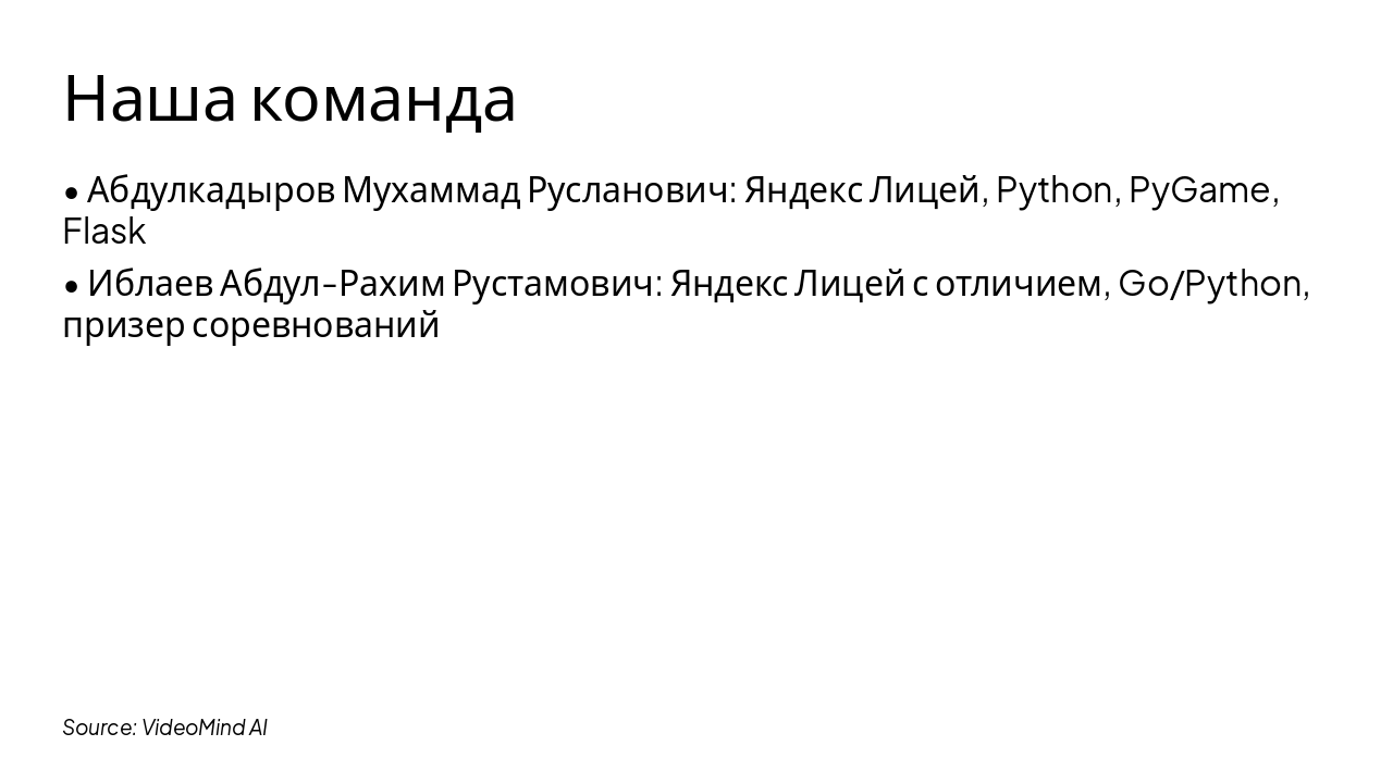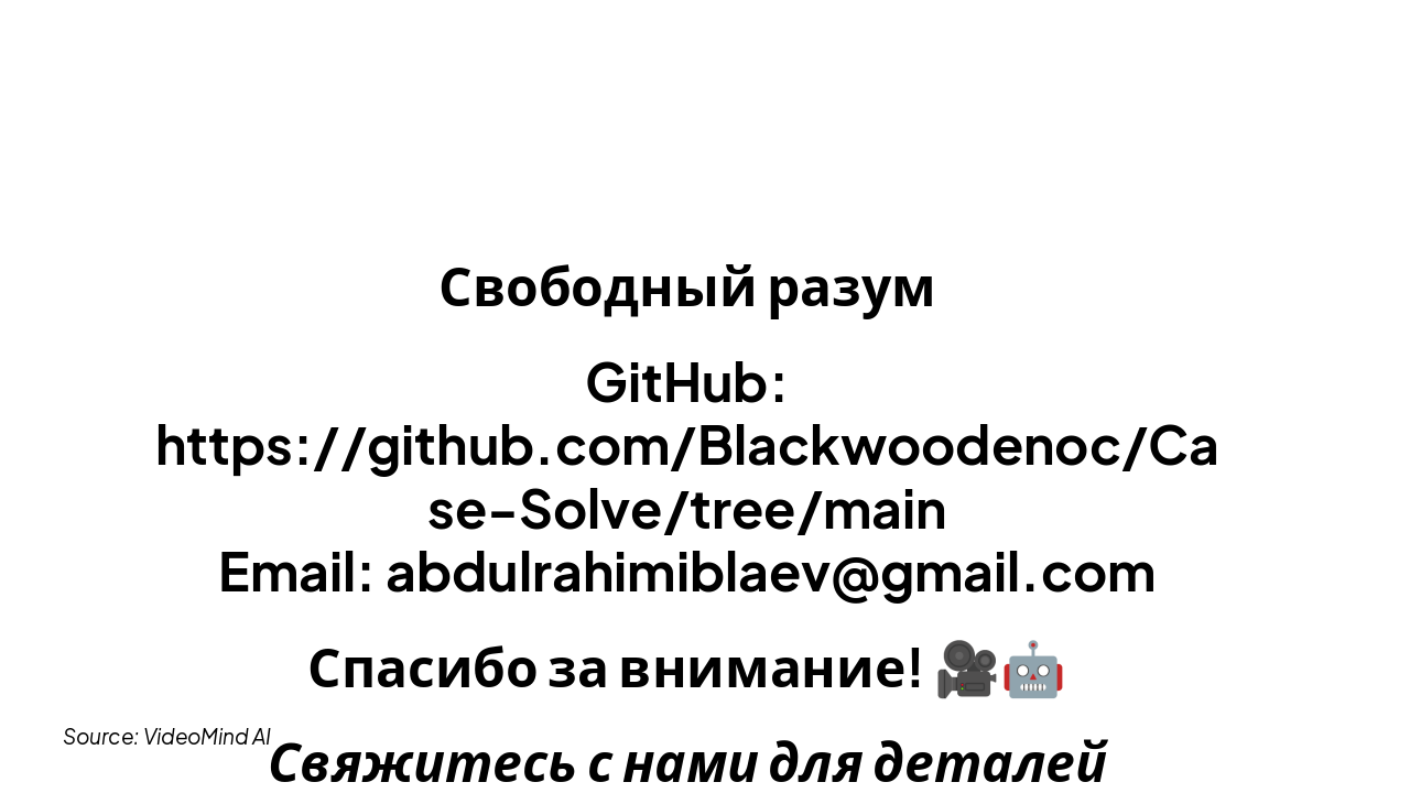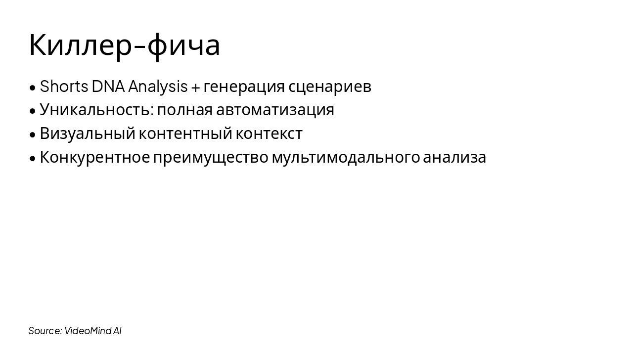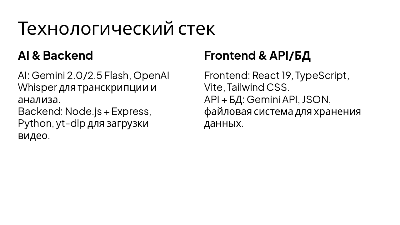 | AI: Gemini 2.0/2.5 Flash, OpenAI Whisper для транскрипции и анализа. Backend: Node.js + Express, Python, yt-dlp для загрузки видео. | Frontend: React 19, TypeScript, Vite, Tailwind CSS. API + БД: Gemini API, JSON, файловая система для хранения данных. |