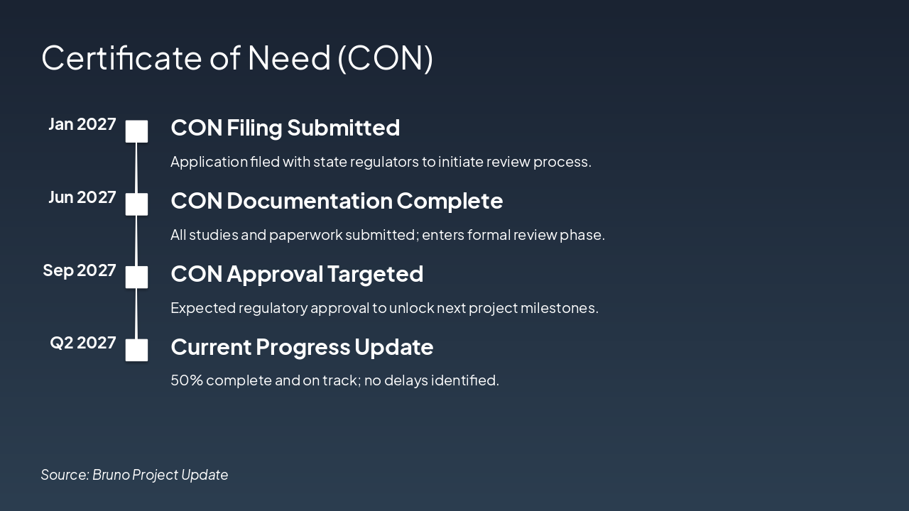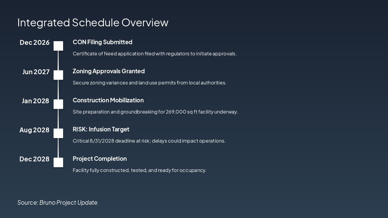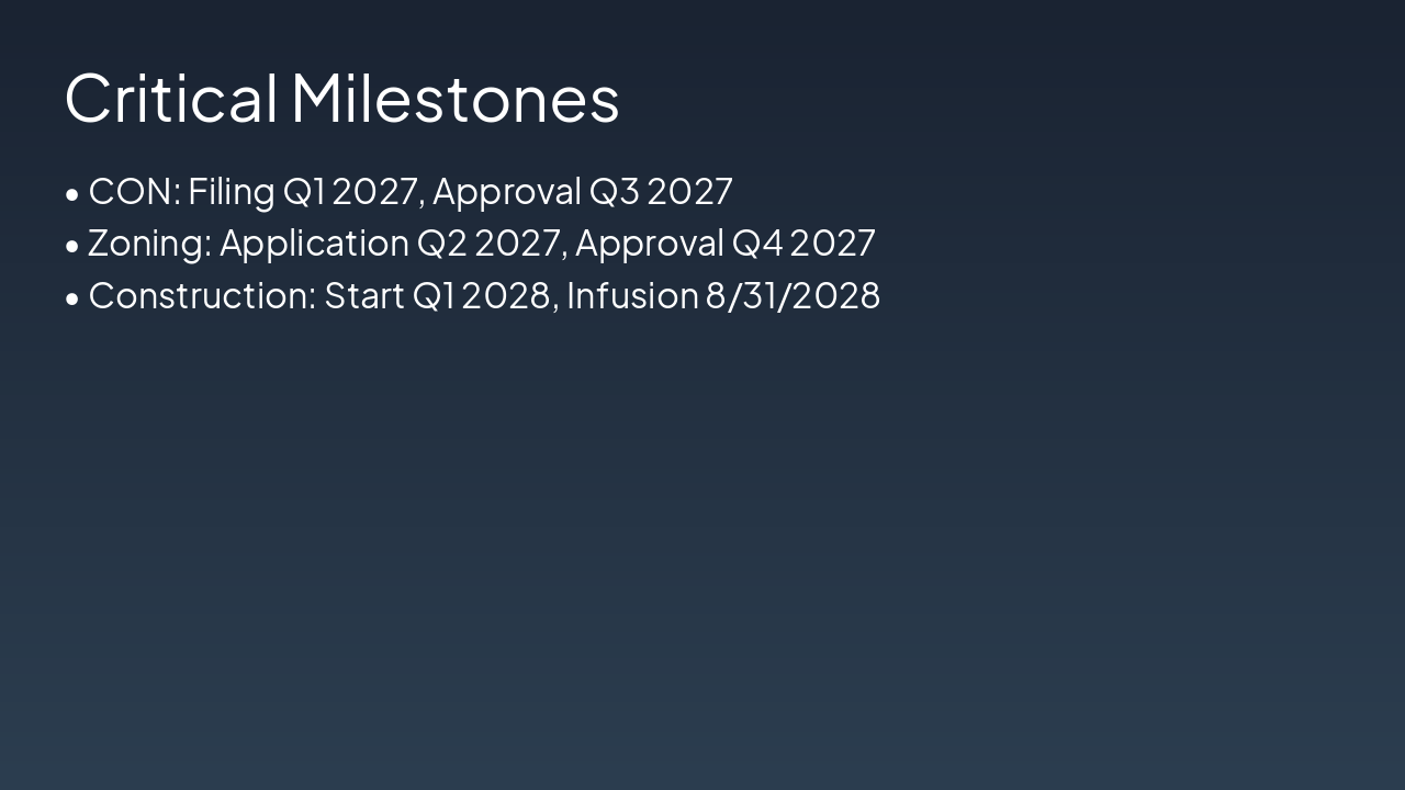 Integrated timeline and critical dates for CON, Zoning, Construction.