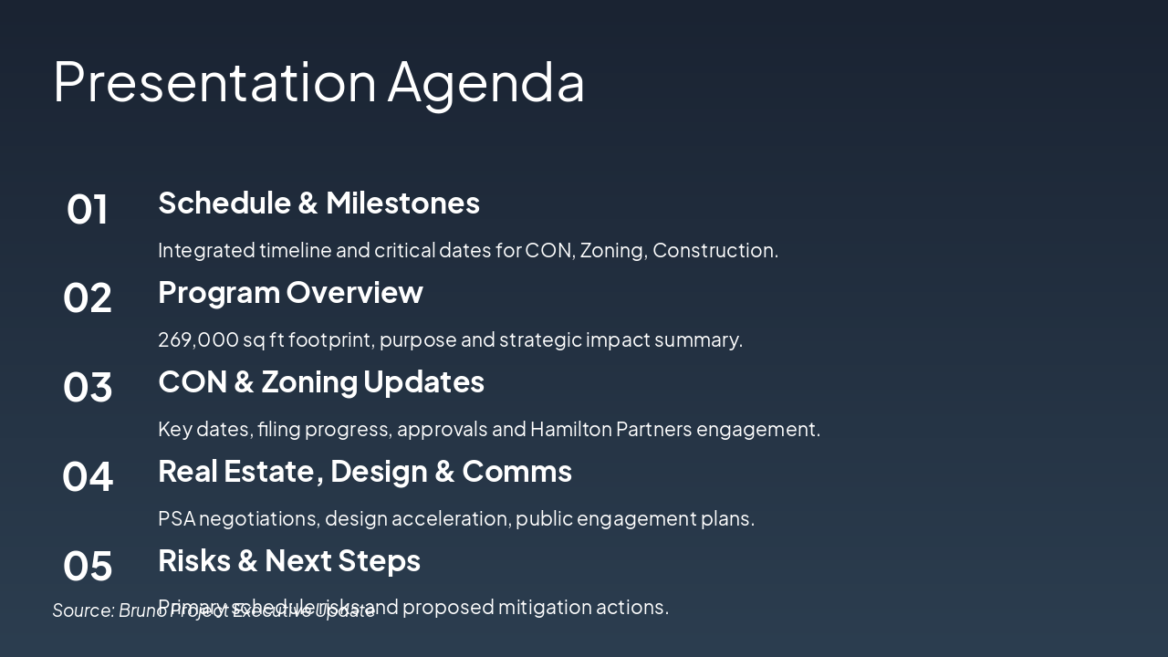 The agenda slide outlines five key presentation topics: Schedule & Milestones, Program Overview (269,000 sq ft footprint and strategic impact), CON & Zoning Updates, Real Estate/Design/Comms, and Risks & Next Steps. Each item includes brief descriptions of timelines, progress, negotiations, public plans, and mitigation actions.