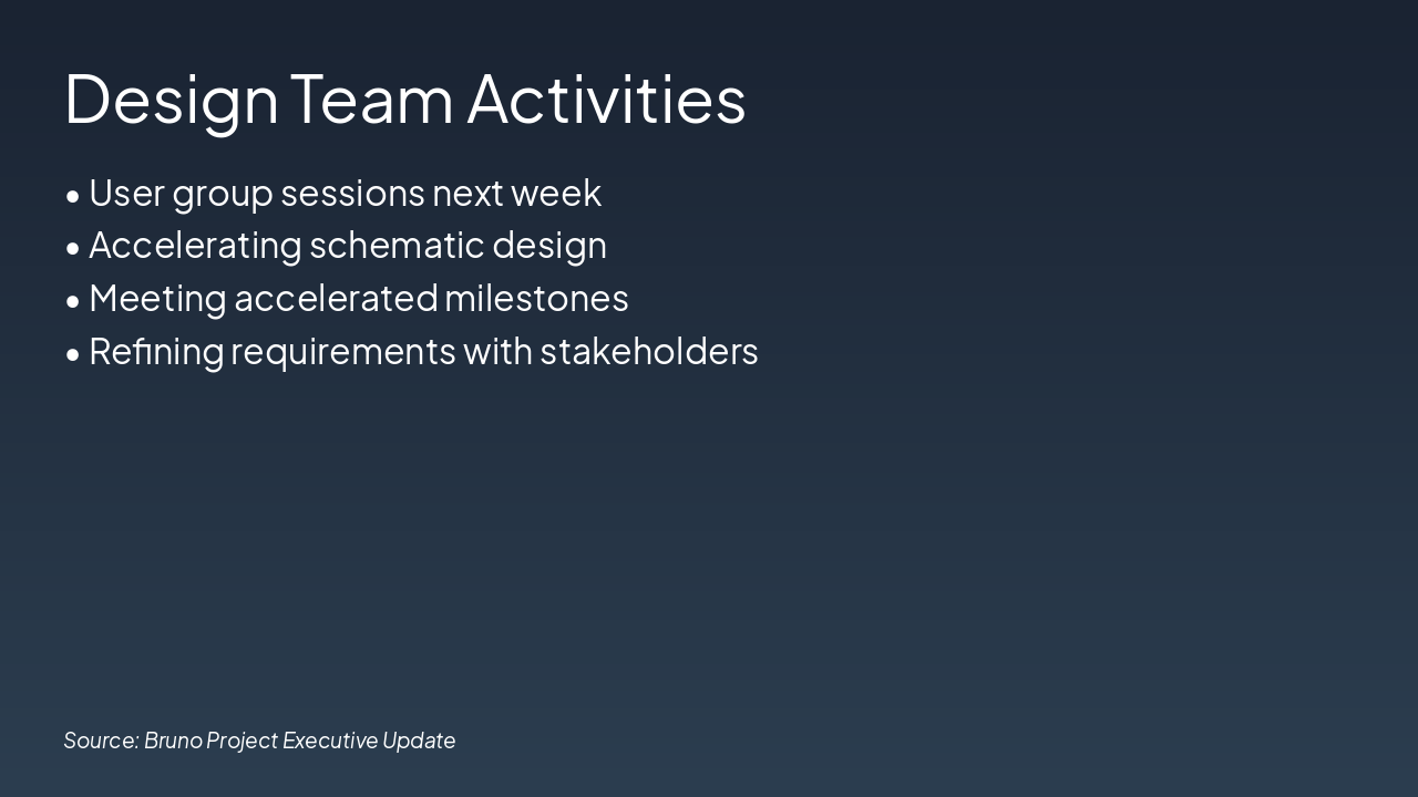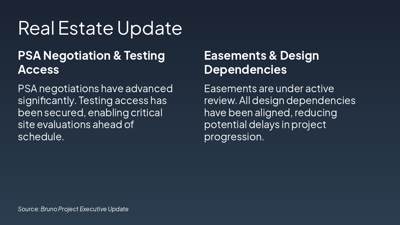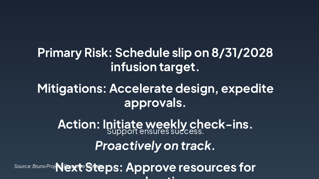 Primary schedule risks and proposed mitigation actions. Source: Bruno Project Executive Update