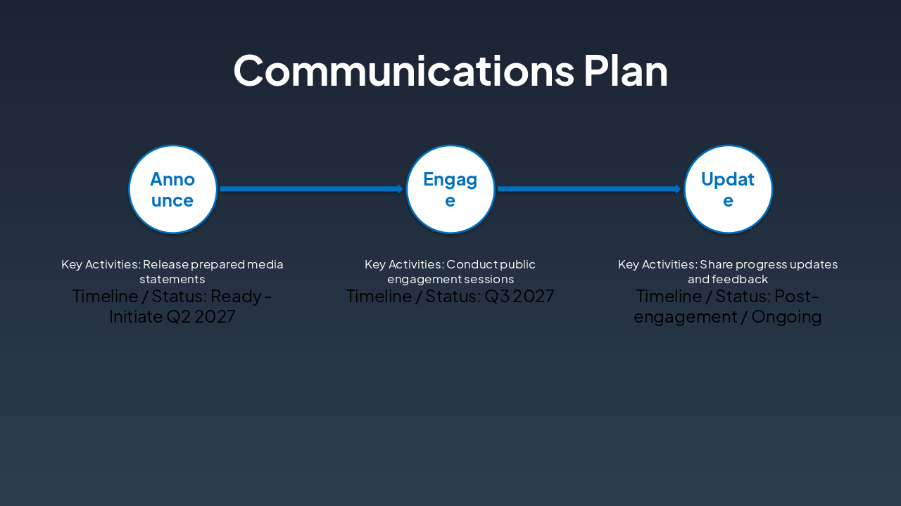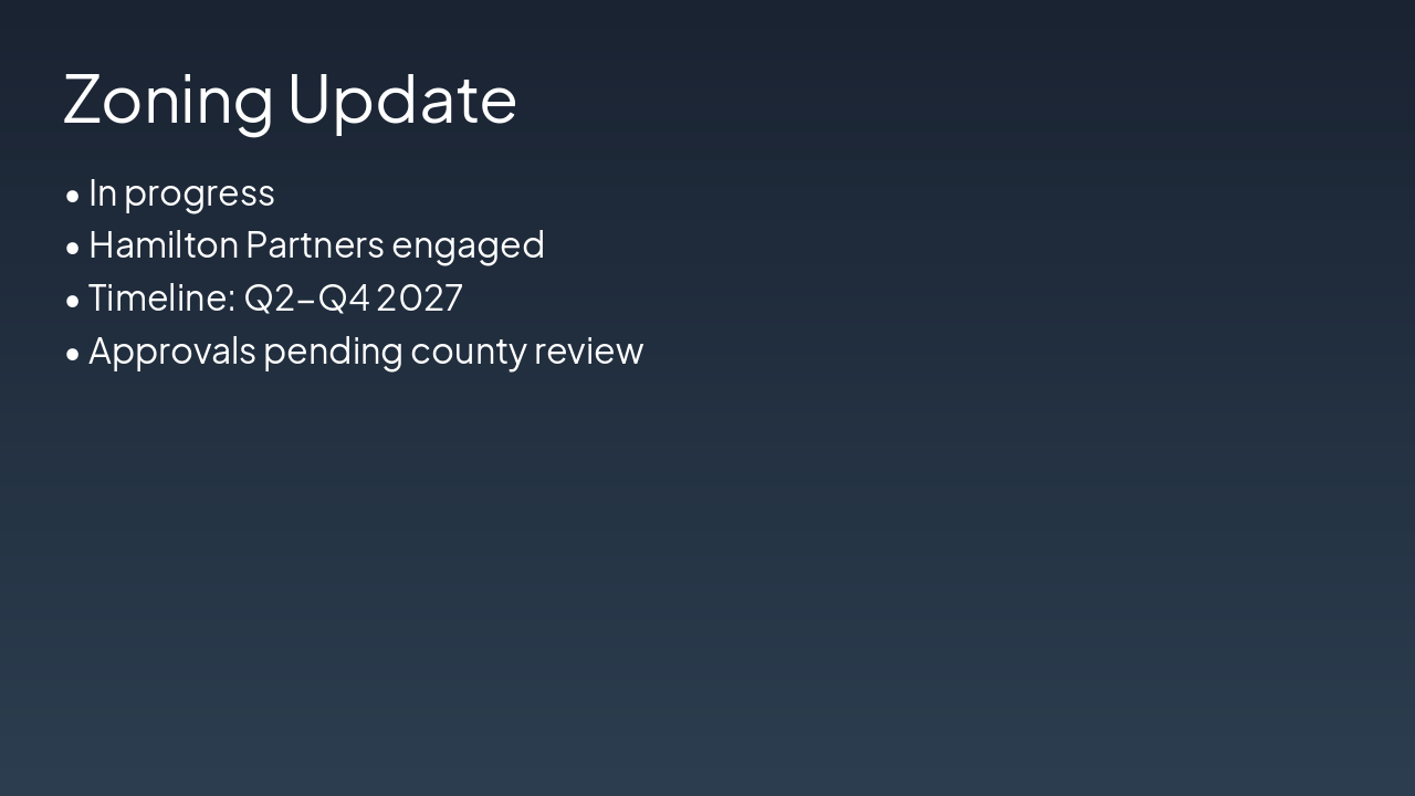 Key dates, filing progress, approvals and Hamilton Partners engagement.
