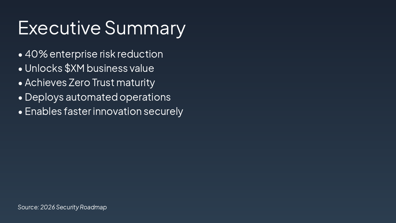 The Executive Summary slide outlines key benefits, including a 40% enterprise risk reduction and unlocking $XM in business value. It also highlights achieving Zero Trust maturity, deploying automated operations, and enabling faster secure innovation.