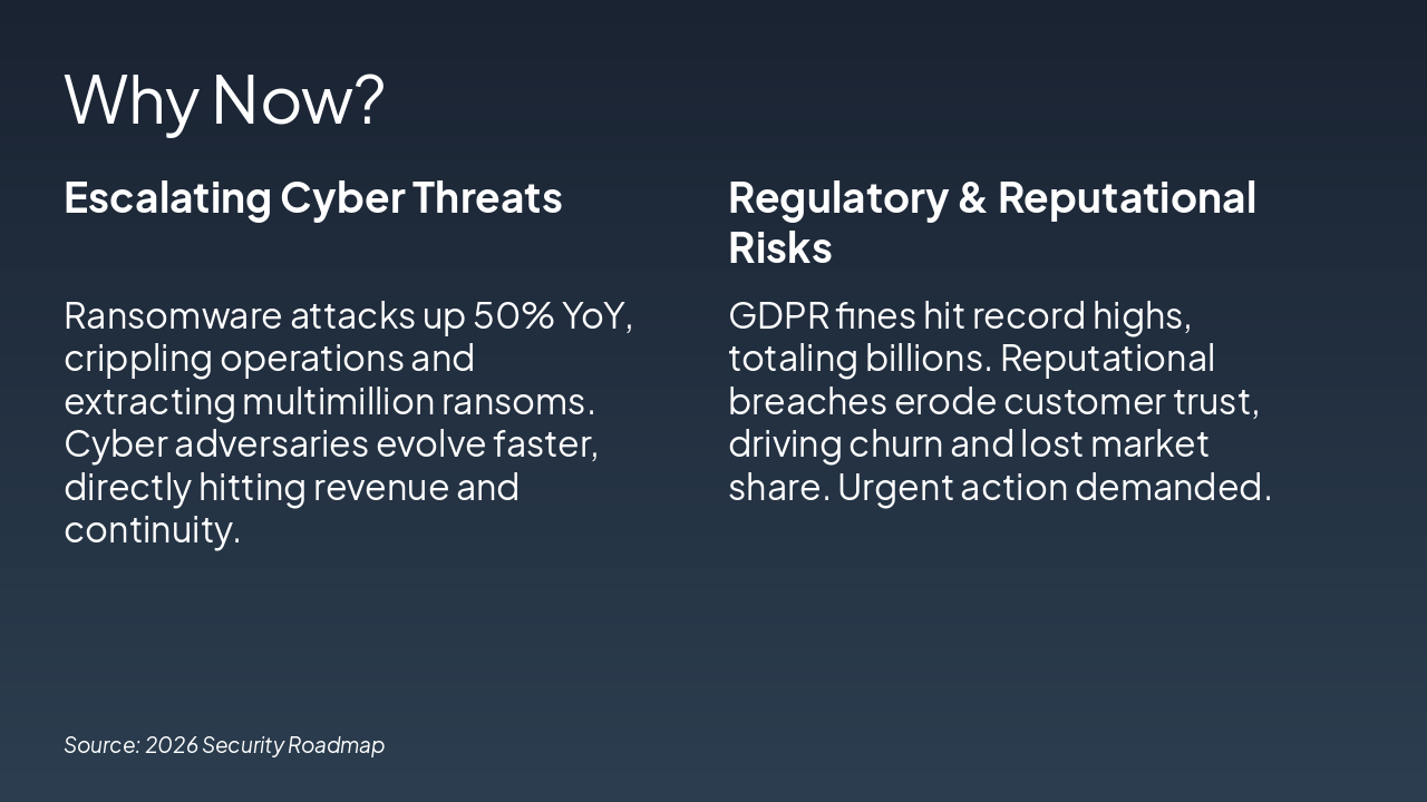 The "Why Now?" slide highlights escalating cyber threats, including a 50% YoY rise in ransomware attacks that cripple operations and hit revenue. It also warns of record-high GDPR fines totaling billions and reputational breaches driving customer churn and market share loss, demanding urgent action.