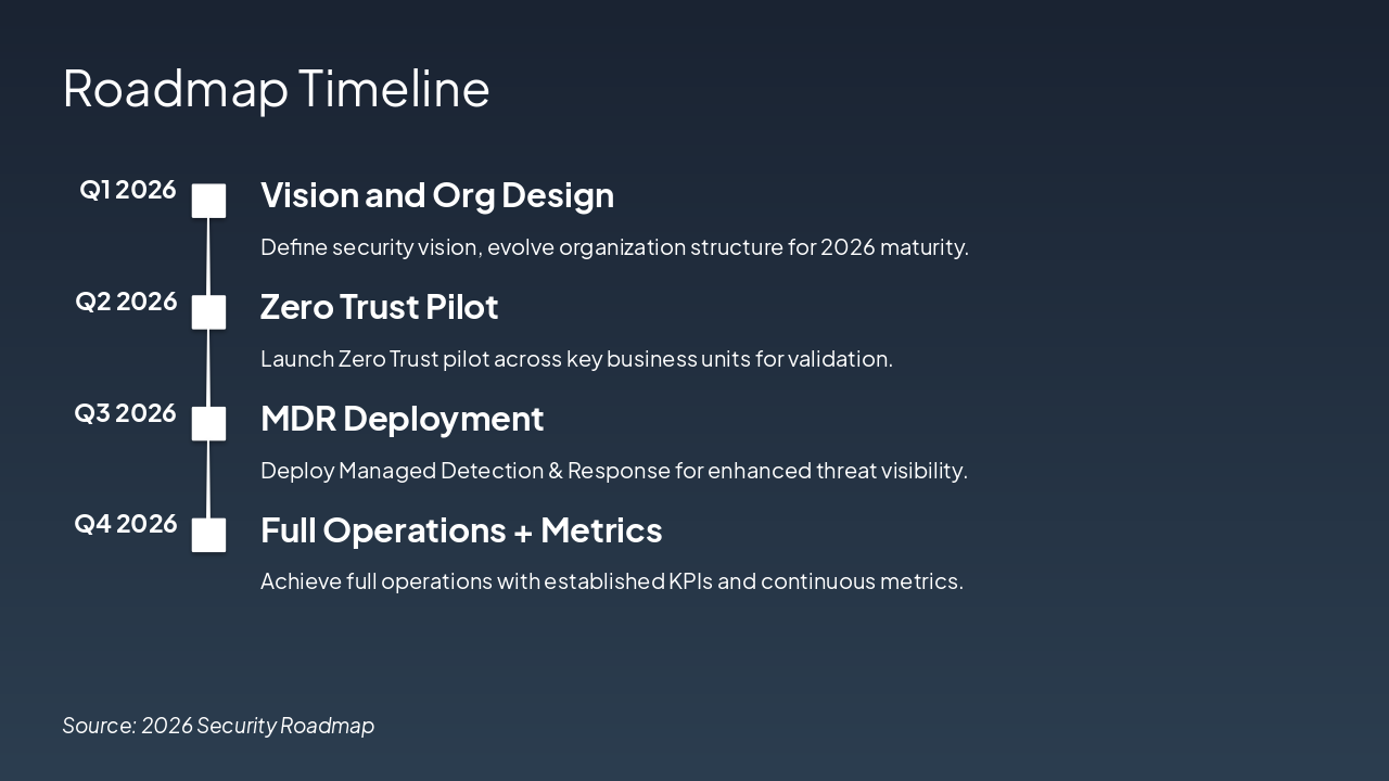 Q1 2026: Vision and Org Design Define security vision, evolve organization structure for 2026 maturity. Q2 2026: Zero Trust Pilot Launch Zero Trust pilot across key business units for validation. Q3 2026: MDR Deployment Deploy Managed Detection & Response for enhanced threat visibility. Q4 2026: Full Operations + Metrics Achieve full operations with established KPIs and continuous metrics.