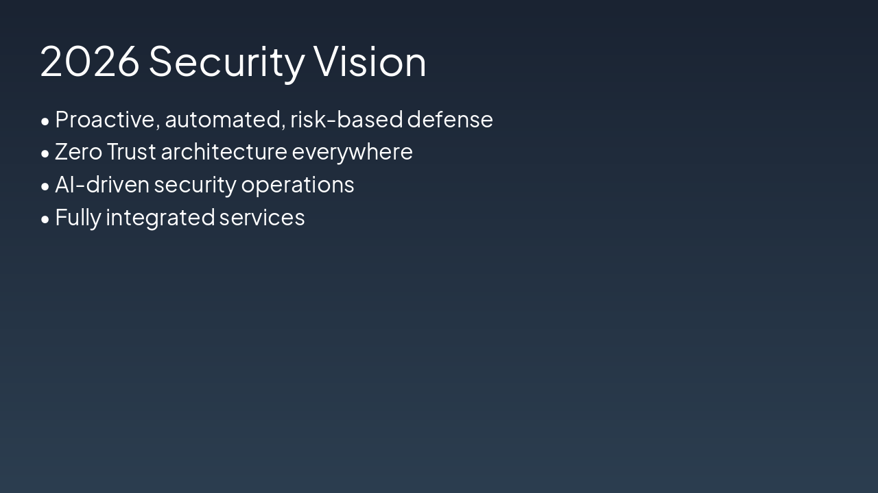 The 2026 Security Vision slide outlines a proactive, automated, risk-based defense with Zero Trust architecture implemented everywhere. It also highlights AI-driven security operations and fully integrated services.