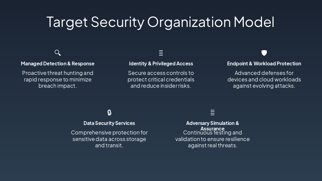 { "features": [ { "icon": "🔍", "heading": "Managed Detection & Response", "description": "Proactive threat hunting and rapid response to minimize breach impact." }, { "icon": "🔐", "heading": "Identity & Privileged Access", "description": "Secure access controls to protect critical credentials and reduce insider risks." }, { "icon": "🛡️", "heading": "Endpoint & Workload Protection", "description": "Advanced defenses for devices and cloud workloads against evolving attacks." }, { "icon": "🔒", "heading": "Data Security Services", "description": "Comprehensive protection for sensitive data across storage and transit." }, { "icon": "🎯", "heading": "Adversary Simulation & Assurance", "description": "Continuous testing and validation to ensure resilience against real threats." } ] }