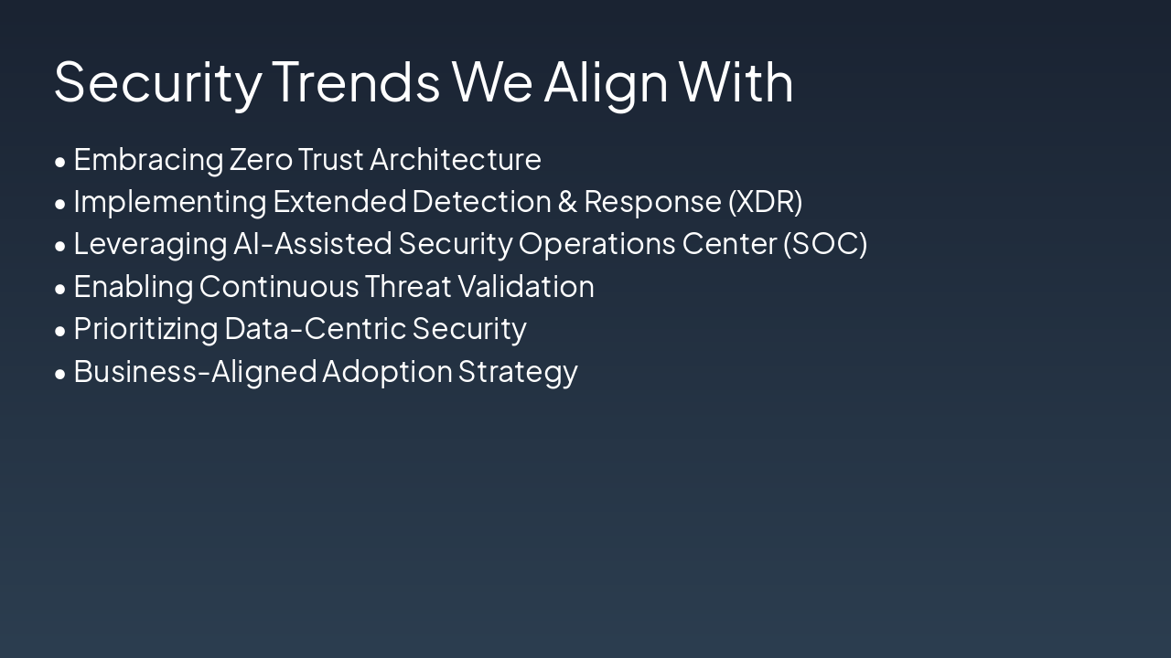 This slide lists key security trends we align with, such as embracing Zero Trust Architecture and implementing Extended Detection & Response (XDR). It also covers leveraging AI-assisted SOC, enabling continuous threat validation, prioritizing data-centric security, and adopting a business-aligned strategy.