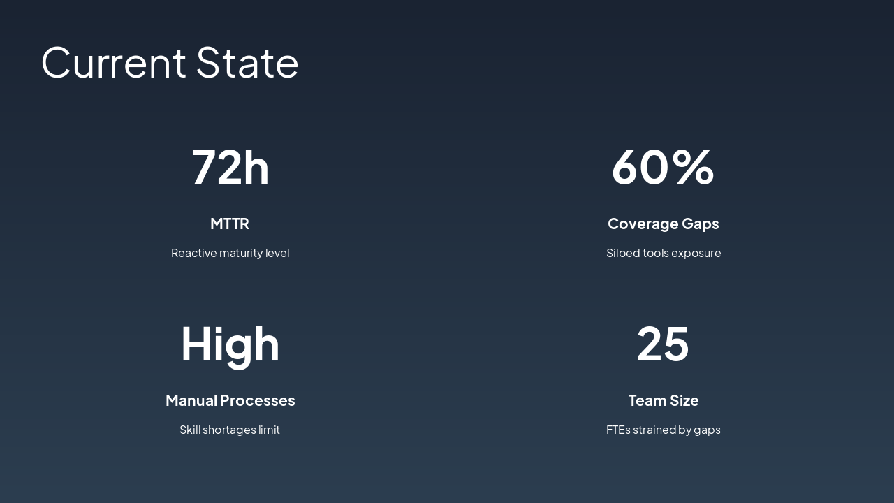 The "Current State" slide shows a 72-hour MTTR indicating reactive maturity and 60% coverage gaps from siloed tools. It also highlights high manual processes limited by skill shortages and a strained team of 25 FTEs.