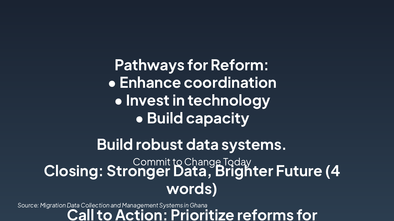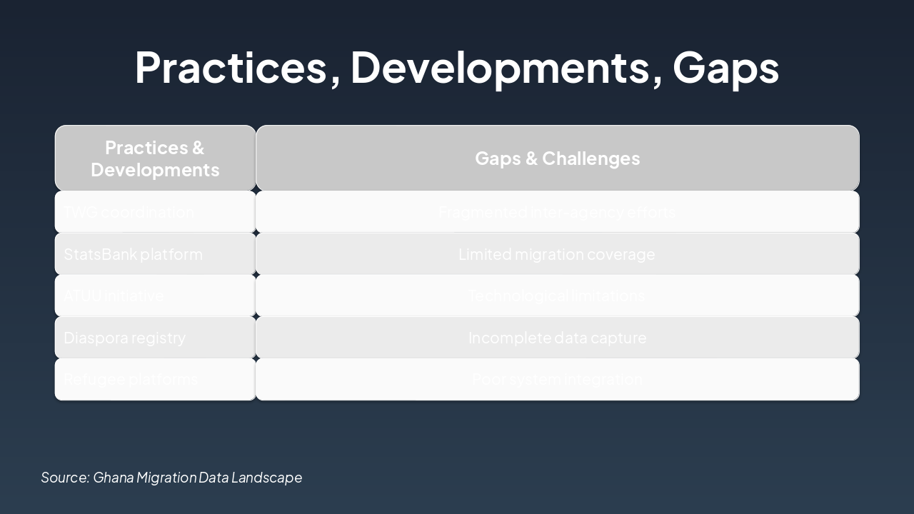 { "headers": [ "Practices & Developments", "Gaps & Challenges" ], "rows": [ [ "TWG coordination", "Fragmented inter-agency efforts" ], [ "StatsBank platform", "Limited migration coverage" ], [ "ATUU initiative", "Technological limitations" ], [ "Diaspora registry", "Incomplete data capture" ], [ "Refugee platforms", "Poor system integration" ] ] }