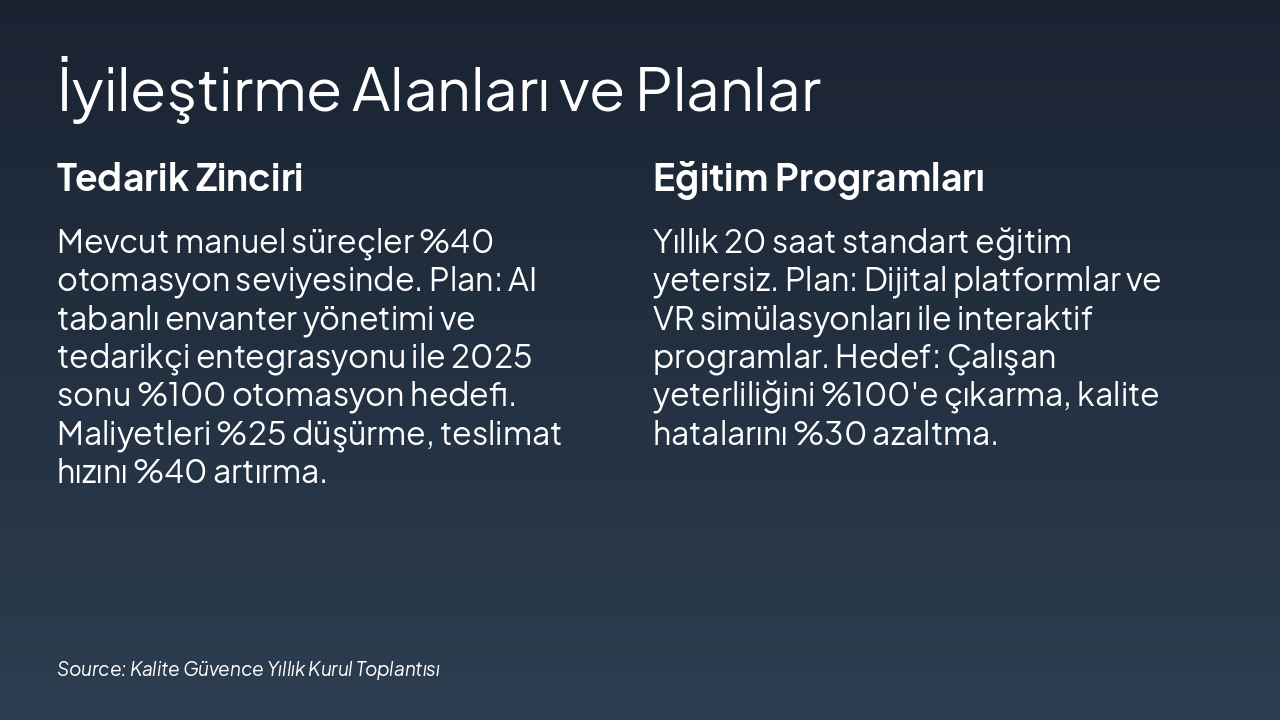 Geliştirilmesi gereken alanlar ve aksiyon planları tartışılacak.