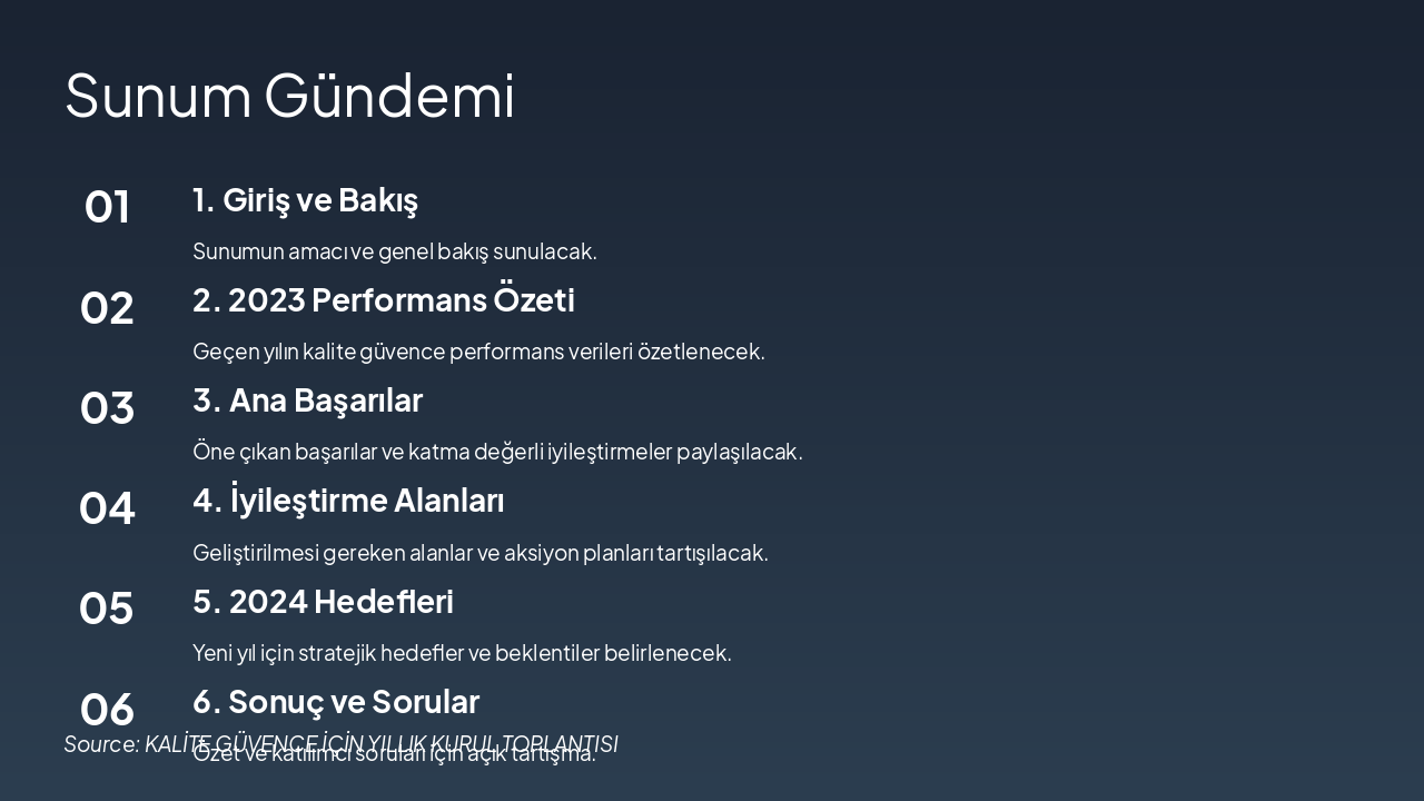 Bu sunum gündemi, giriş ve genel bakıştan başlayarak 2023 performans özeti, ana başarılar, iyileştirme alanları ve 2024 hedeflerini kapsar. Son kısımda ise sonuç özeti ve katılımcı soruları için açık tartışma yer alır.