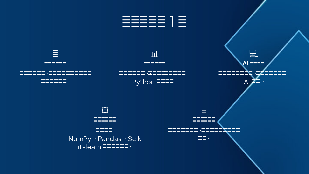 { "features": [ { "icon": "🧠", "heading": "机器学习基础", "description": "掌握监督学习、无监督学习核心概念与简单算法应用。" }, { "icon": "📊", "heading": "数据分析技能", "description": "学习数据清洗、可视化、统计分析及Python工具使用。" }, { "icon": "💻", "heading": "AI项目实践", "description": "动手开发图像识别、预测模型等完整AI项目。" }, { "icon": "⚙️", "heading": "编程工具掌握", "description": "熟练运用NumPy、Pandas、Scikit-learn等数据科学库。" }, { "icon": "🚀", "heading": "模型优化策略", "description": "探索超参数调优、交叉验证与性能提升技巧。" } ] }
