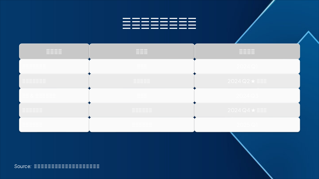 { "headers": [ "交付内容", "责任方", "时间节点" ], "rows": [ [ "方案设计与评审", "项目组", "2024 Q1" ], [ "幼儿园课程体系", "教育专家组", "2024 Q2 ★里程碑" ], [ "小学&中学课程开发", "项目组", "2024 Q3" ], [ "示范案例落地", "市中区教育局", "2024 Q4 ★里程碑" ], [ "整体交付验收", "政府联合验收", "2025 Q1" ] ] }
