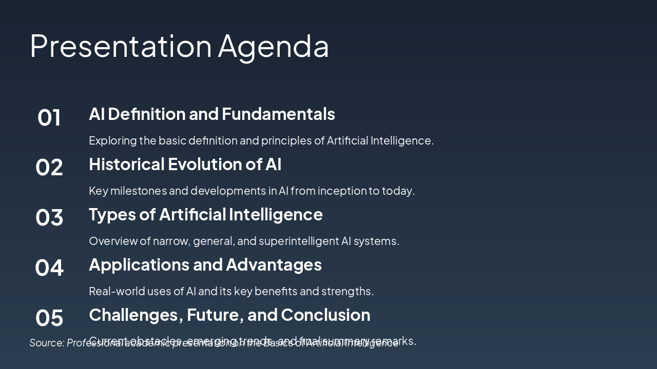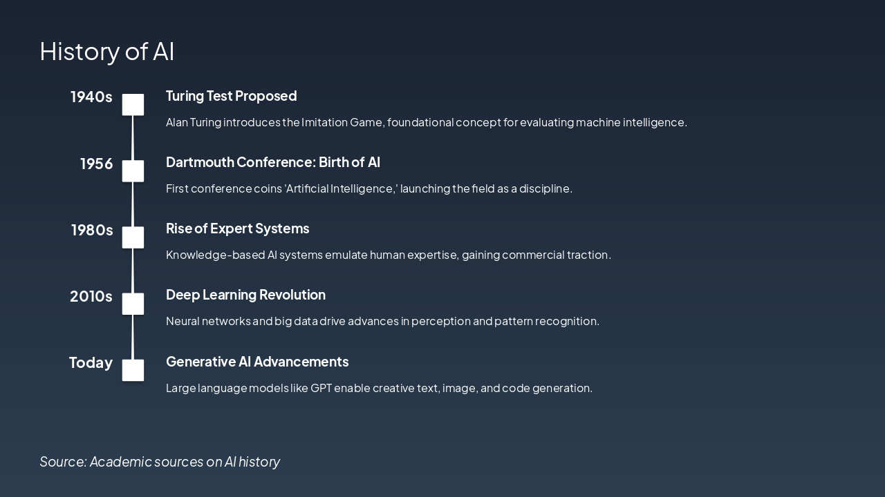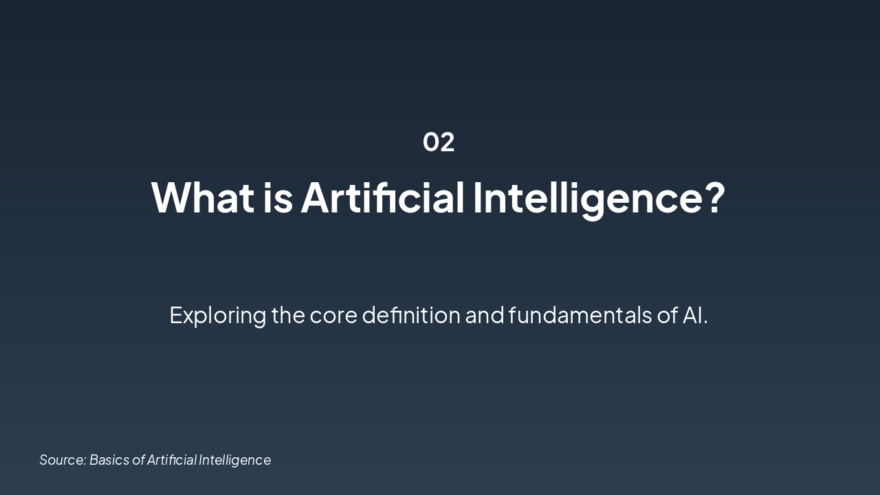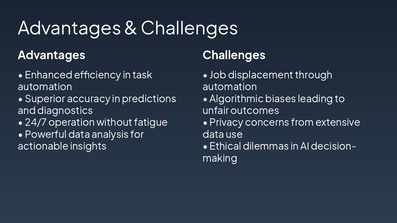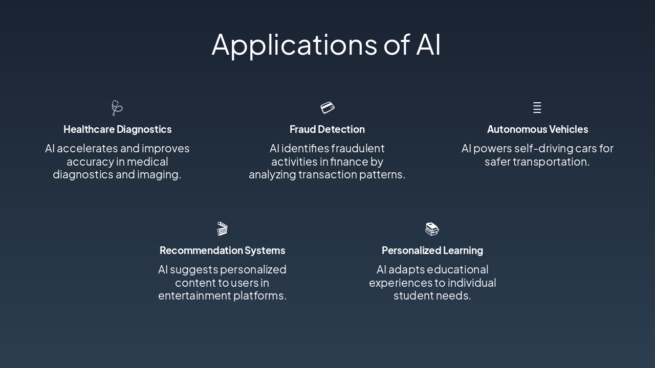 The "Applications of AI" slide features a grid showcasing five key uses of AI across industries. It highlights healthcare diagnostics for accurate imaging, fraud detection in finance, autonomous vehicles for safer driving, personalized content recommendations, and adaptive learning for students.