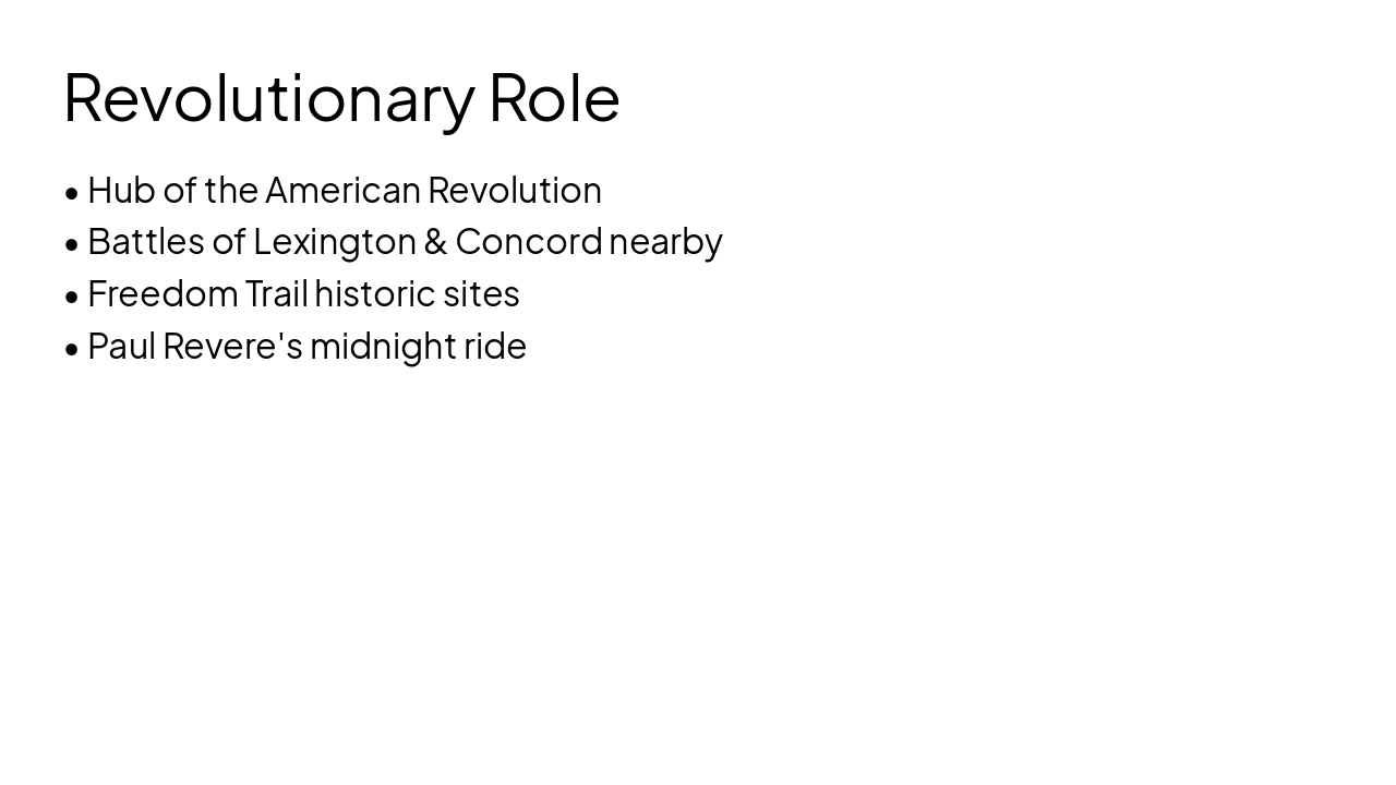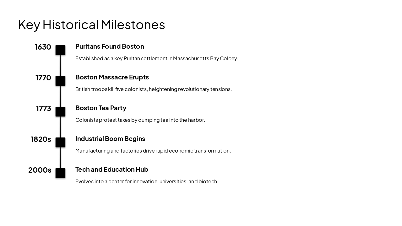 1630: Puritans Found Boston Established as a key Puritan settlement in Massachusetts Bay Colony. 1770: Boston Massacre Erupts British troops kill five colonists, heightening revolutionary tensions. 1773: Boston Tea Party Colonists protest taxes by dumping tea into the harbor. 1820s: Industrial Boom Begins Manufacturing and factories drive rapid economic transformation. 2000s: Tech and Education Hub Evolves into a center for innovation, universities, and biotech.