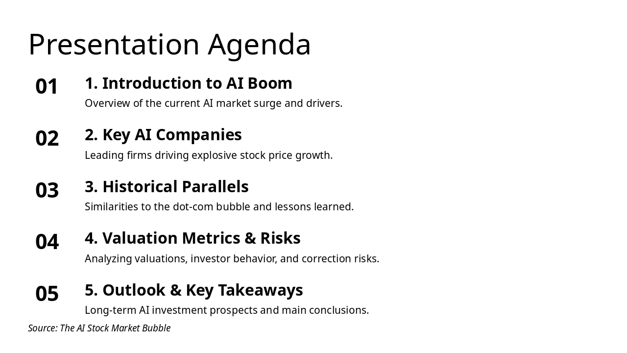 This agenda slide outlines a five-part presentation on the AI boom: introduction to market drivers, key companies fueling stock growth, historical parallels to the dot-com bubble, valuation metrics and risks, and outlook with takeaways. Each item includes a concise description of its focus, from surge overviews to long-term investment insights.