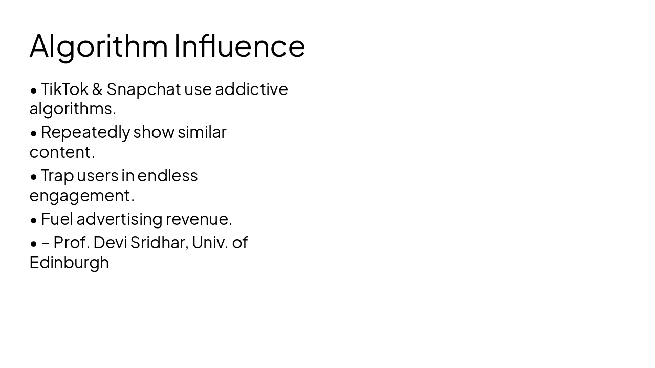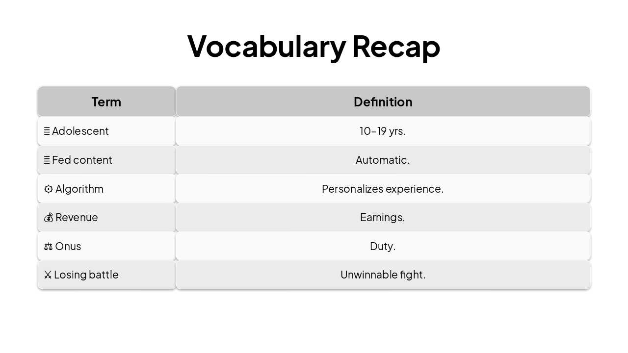 Title: Are You Addicted to Social Media? Slide 1: Introduction - Discussion about social media addiction - Popular apps: Snapchat, TikTok, Threads - Easy to spend more time online than intended Slide 2: Personal Reflection - Many people feel they spend too much time on social media - Some studies compare social media addiction to gambling Slide 3: Research Findings - US research: Adolescents (ages 10–19) using social media 3+ hours/day have double the risk of depression & anxiety - Parents’ concerns about mental health effects - US considering regulations for teen social media use Slide 4: Expert Concerns - Health experts agree on negative chronic effects - 64% of teens exposed to hate-based content - Social media linked to poor body image Slide 5: Teen Usage Statistics - Question: What % of 13–24-year-olds use Snapchat? - Answer: 90% Slide 6: Algorithm Influence - Platforms like TikTok & Snapchat show similar content repeatedly - Professor Devi Sridhar warns about addictive algorithms - Algorithms keep users engaged for advertising revenue Slide 7: Understanding Key Terms - Fed content: Content shown automatically by platforms - Algorithm: Rules & calculations that personalize what users see - Revenue: Money earned by companies (e.g., from ads) Slide 8: Parental Challenges - Onus on parents to manage teen screen time - Difficult to limit social media use as it’s teens’ main social space - “Losing battle” for many parents Slide 9: Vocabulary Recap - Adolescent: Person aged 10–19 - Fed content: Given automatically - Algorithm: Personalizes user experience - Revenue: Company earnings - Onus: Responsibility or duty - Losing battle: Fight you cannot win Slide 10: Conclusion - Social media is deeply integrated into teen life - Awareness & regulation may help balance usage