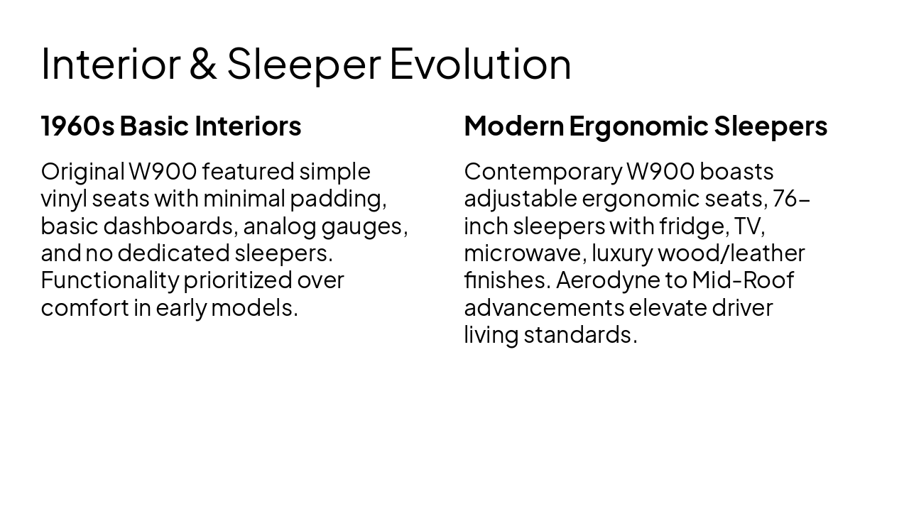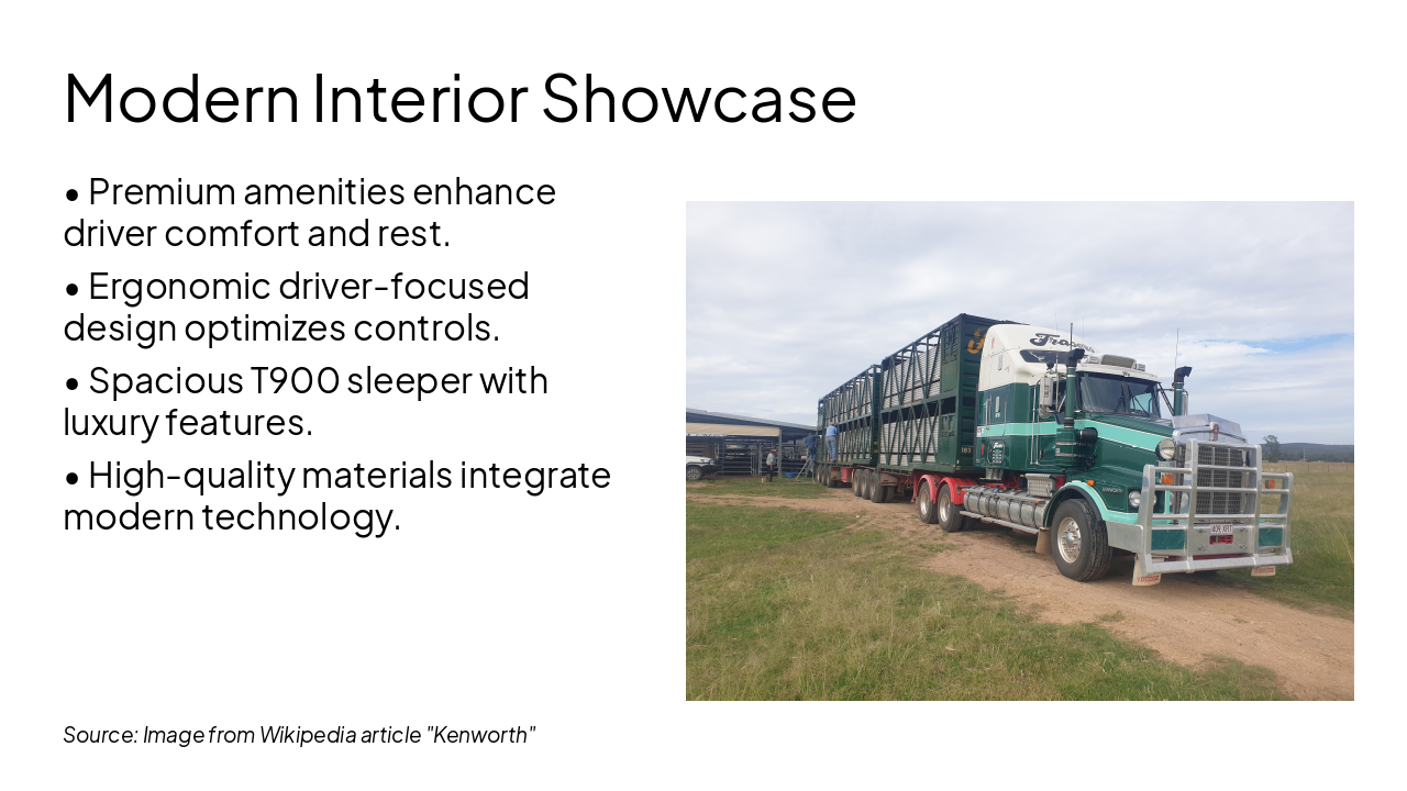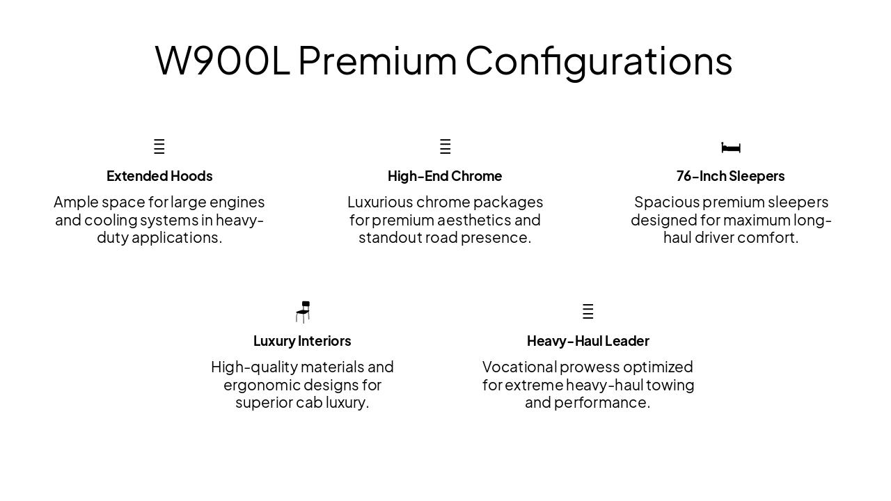 { "features": [ { "icon": "🚜", "heading": "Extended Hoods", "description": "Ample space for large engines and cooling systems in heavy-duty applications." }, { "icon": "💎", "heading": "High-End Chrome", "description": "Luxurious chrome packages for premium aesthetics and standout road presence." }, { "icon": "🛏️", "heading": "76-Inch Sleepers", "description": "Spacious premium sleepers designed for maximum long-haul driver comfort." }, { "icon": "🪑", "heading": "Luxury Interiors", "description": "High-quality materials and ergonomic designs for superior cab luxury." }, { "icon": "💪", "heading": "Heavy-Haul Leader", "description": "Vocational prowess optimized for extreme heavy-haul towing and performance." } ] }