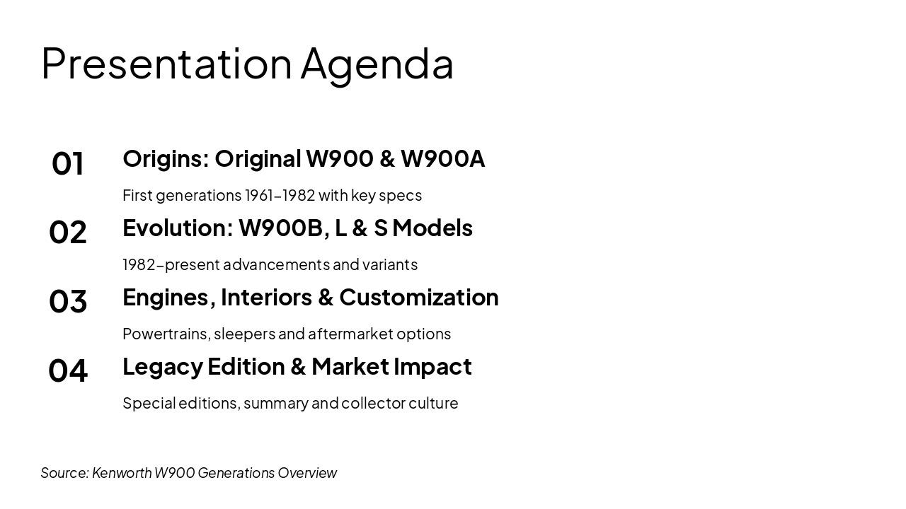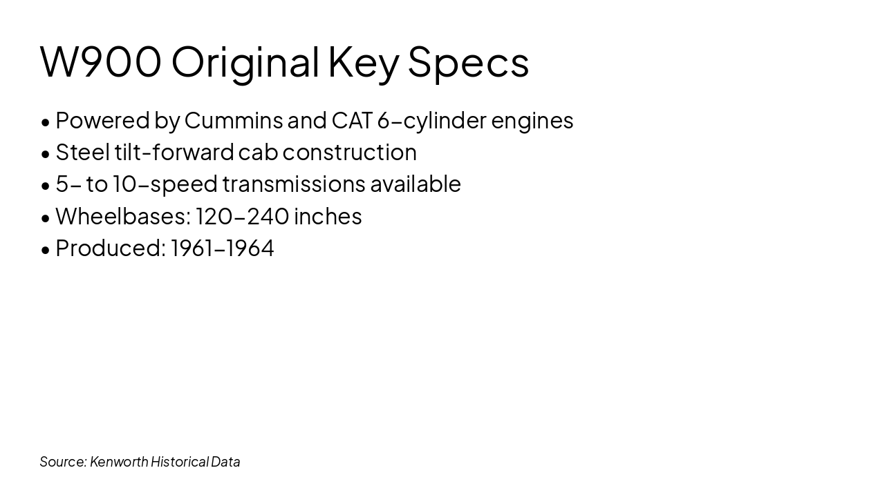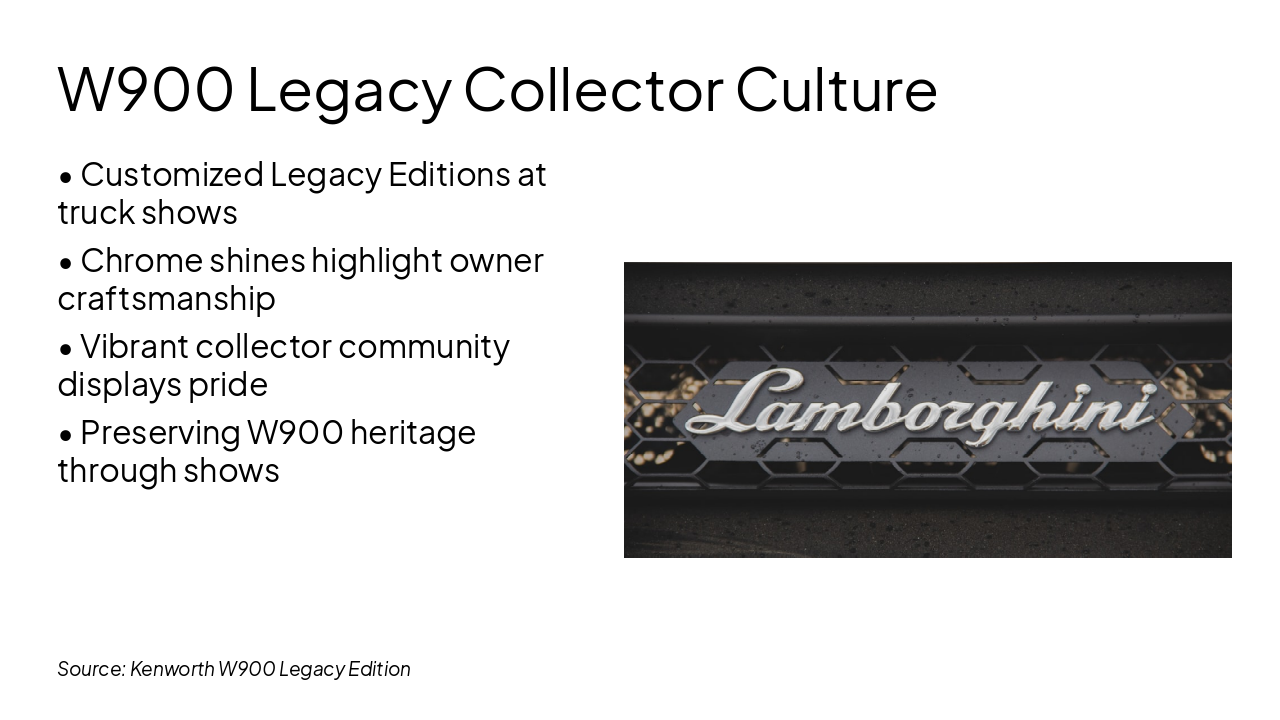 The W900L Premium Configurations slide highlights five premium features: extended hoods for heavy-duty engines, high-end chrome for luxury aesthetics, 76-inch sleepers for driver comfort, luxury interiors, and heavy-haul leadership. These options emphasize spacious engineering, standout style, ergonomic cab luxury, and superior towing performance.