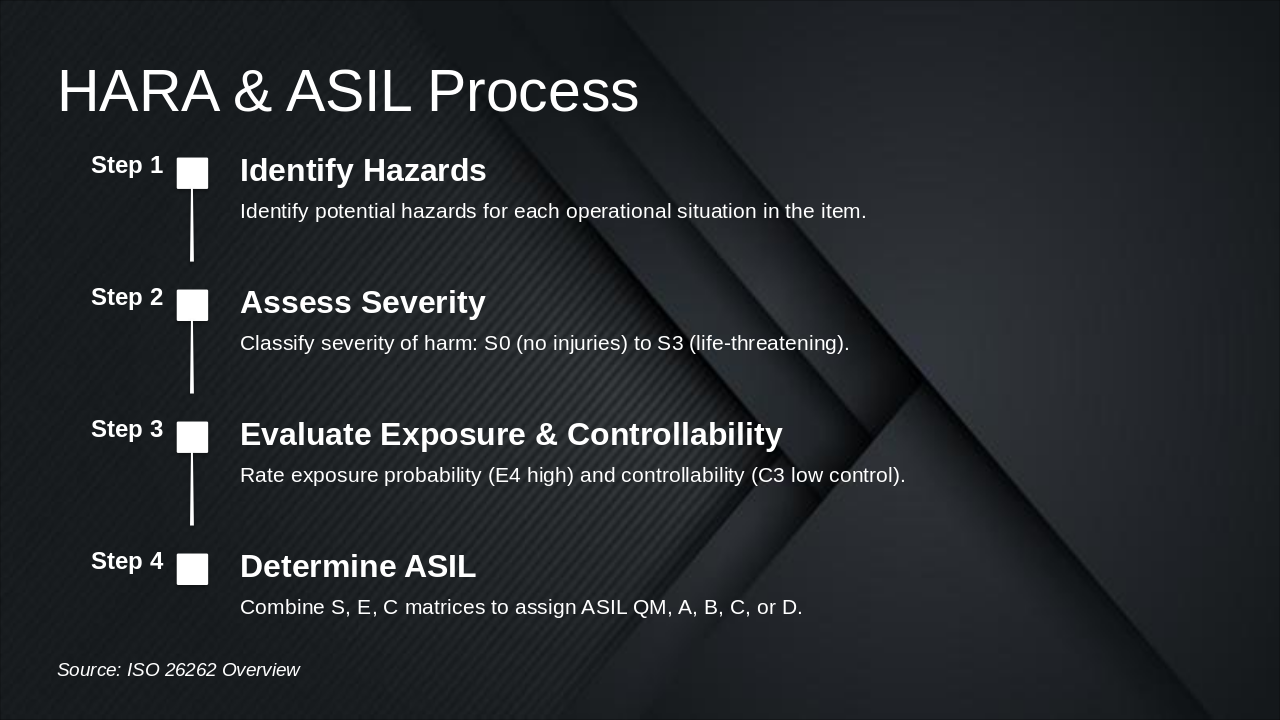 Step 1: Identify Hazards Identify potential hazards for each operational situation in the item. Step 2: Assess Severity Classify severity of harm: S0 (no injuries) to S3 (life-threatening). Step 3: Evaluate Exposure & Controllability Rate exposure probability (E4 high) and controllability (C3 low control). Step 4: Determine ASIL Combine S, E, C matrices to assign ASIL QM, A, B, C, or D.
