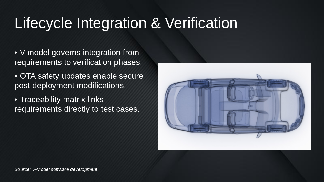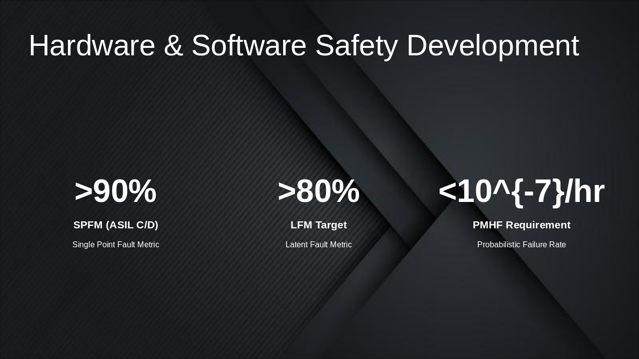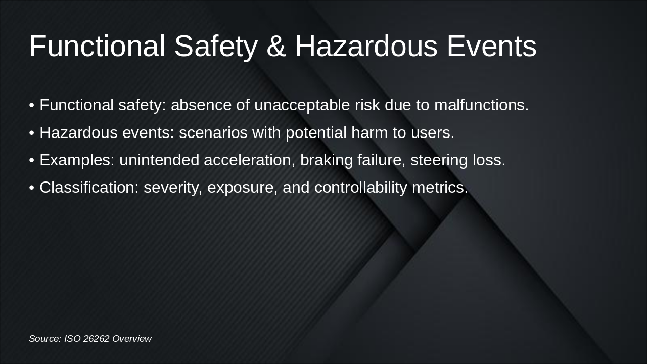 The slide presents the HARA & ASIL Process as a four-step timeline. It covers identifying hazards per operational situation, assessing severity (S0 no injuries to S3 life-threatening), evaluating exposure (E4 high) and controllability (C3 low), and determining ASIL (QM to D) via S, E, C matrices.