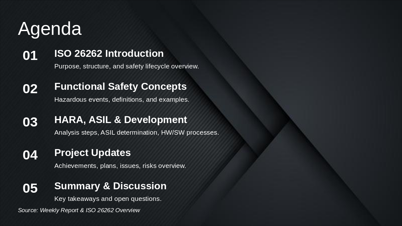 HARA steps: Identify hazards, assess risks, determine ASIL (A-D). ASIL based on severity, exposure, controllability.