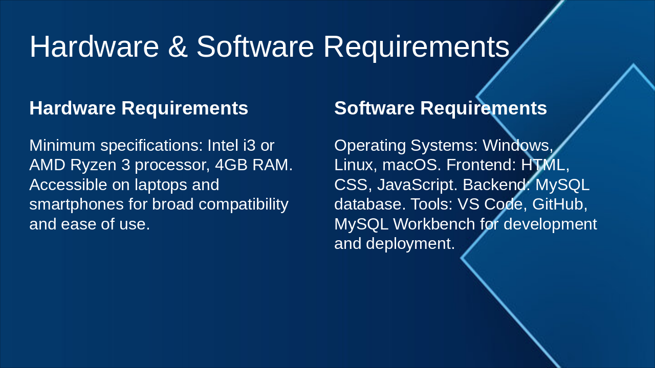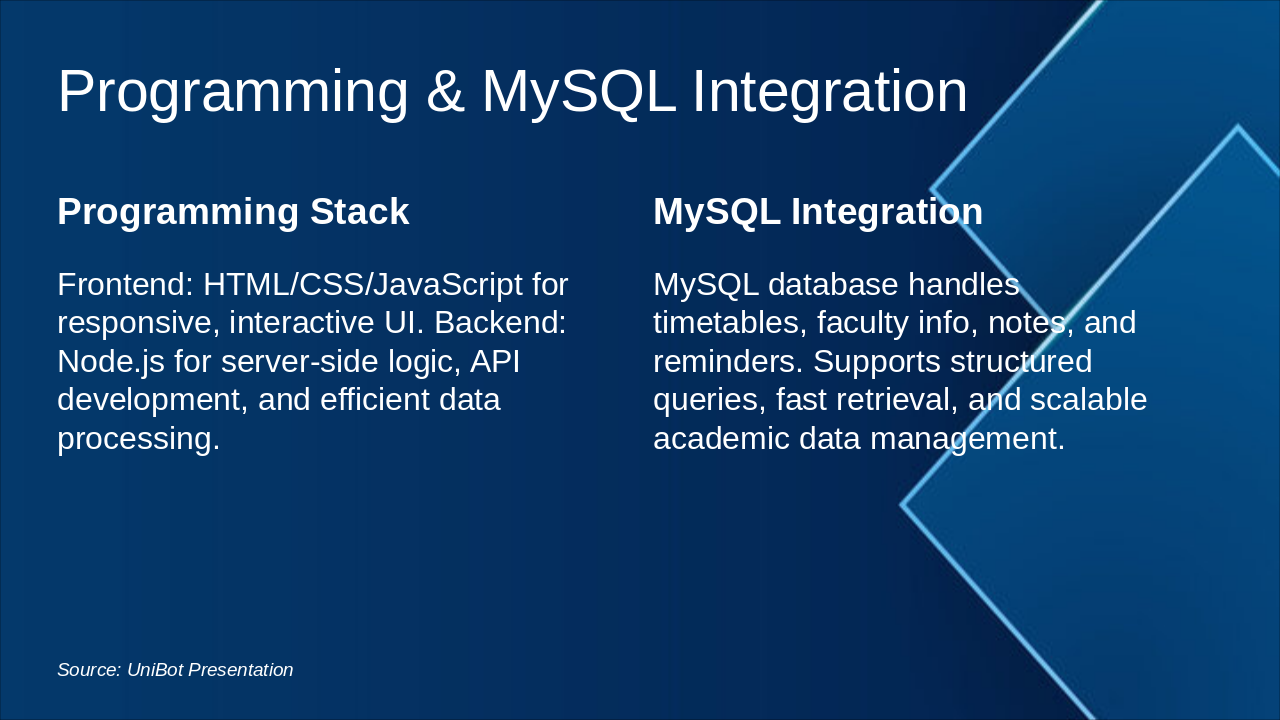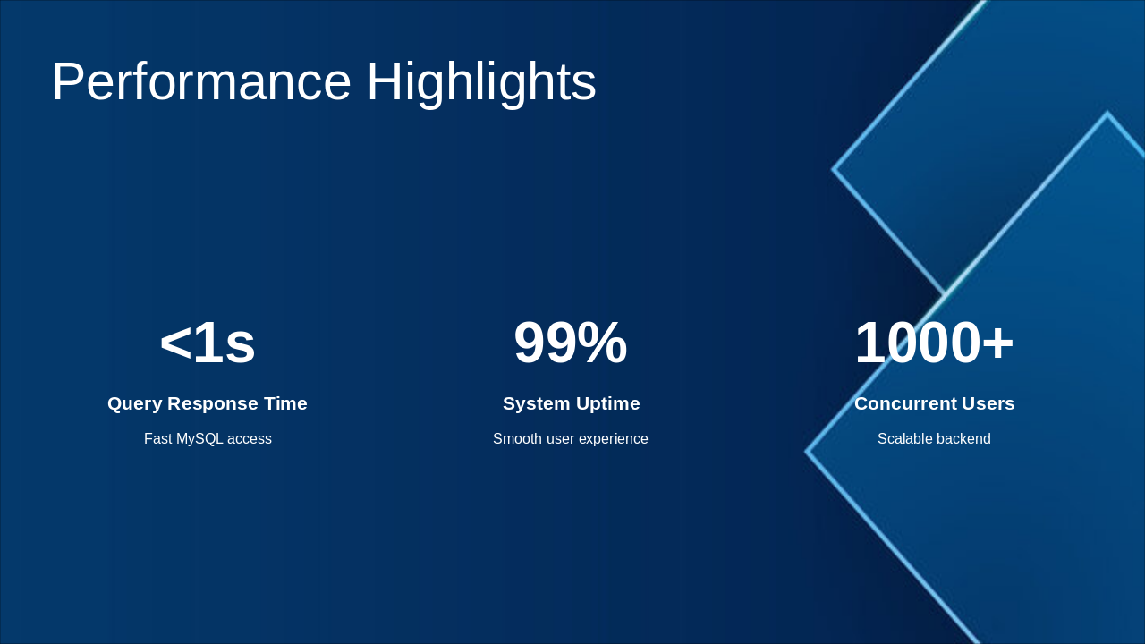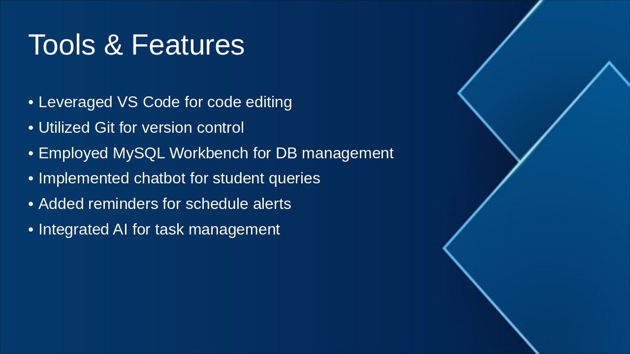 Frontend, Node.js backend, MySQL integration, features.