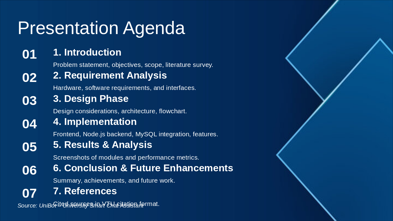 The agenda slide outlines a seven-section presentation structure: Introduction (problem, objectives, scope, literature), Requirement Analysis (hardware/software, interfaces), Design Phase (considerations, architecture, flowchart), and Implementation (frontend, Node.js backend, MySQL, features). It continues with Results & Analysis (screenshots, metrics), Conclusion & Future Enhancements (summary, achievements, future work), and References (VTU citations).