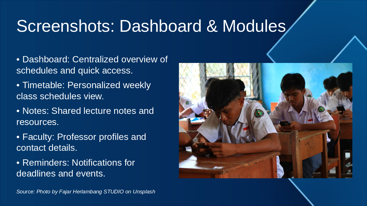 Screenshots of modules and performance metrics.