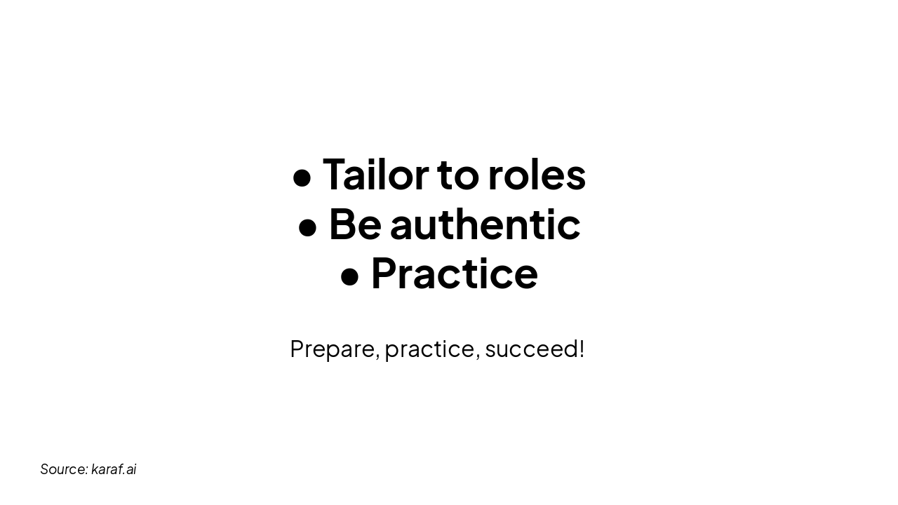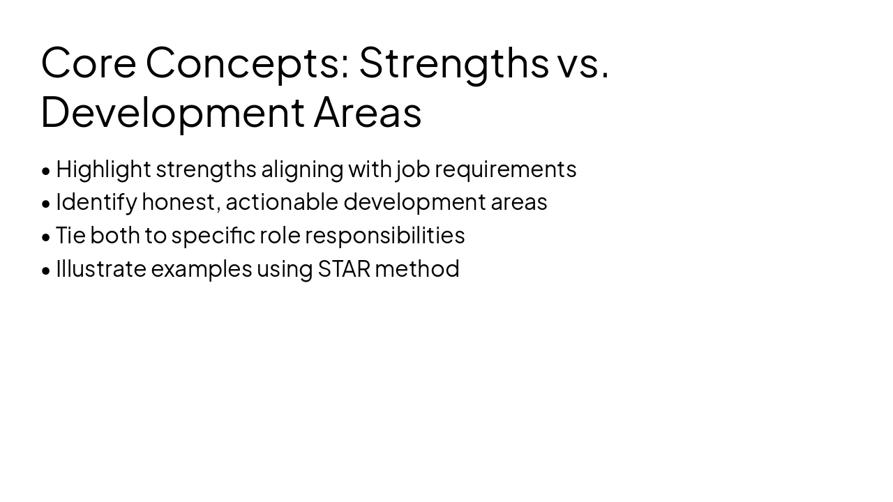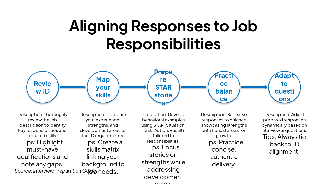 { "headers": [ "Step", "Description", "Tips" ], "rows": [ [ "Review JD", "Thoroughly review the job description to identify key responsibilities and required skills.", "Highlight must-have qualifications and note any gaps." ], [ "Map your skills", "Compare your experience, strengths, and development areas to the JD requirements.", "Create a skills matrix linking your background to job needs." ], [ "Prepare STAR stories", "Develop behavioral examples using STAR (Situation, Task, Action, Result) tailored to responsibilities.", "Focus stories on strengths while addressing development areas." ], [ "Practice balance", "Rehearse responses to balance showcasing strengths with honest areas for growth.", "Practice concise, authentic delivery." ], [ "Adapt to questions", "Adjust prepared responses dynamically based on interviewer questions.", "Always tie back to JD alignment." ] ] }
