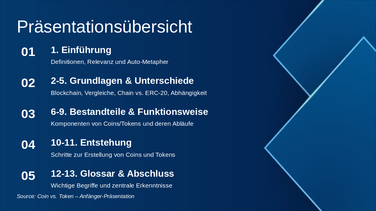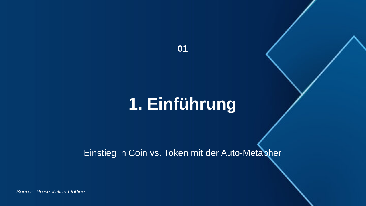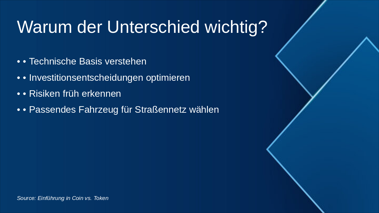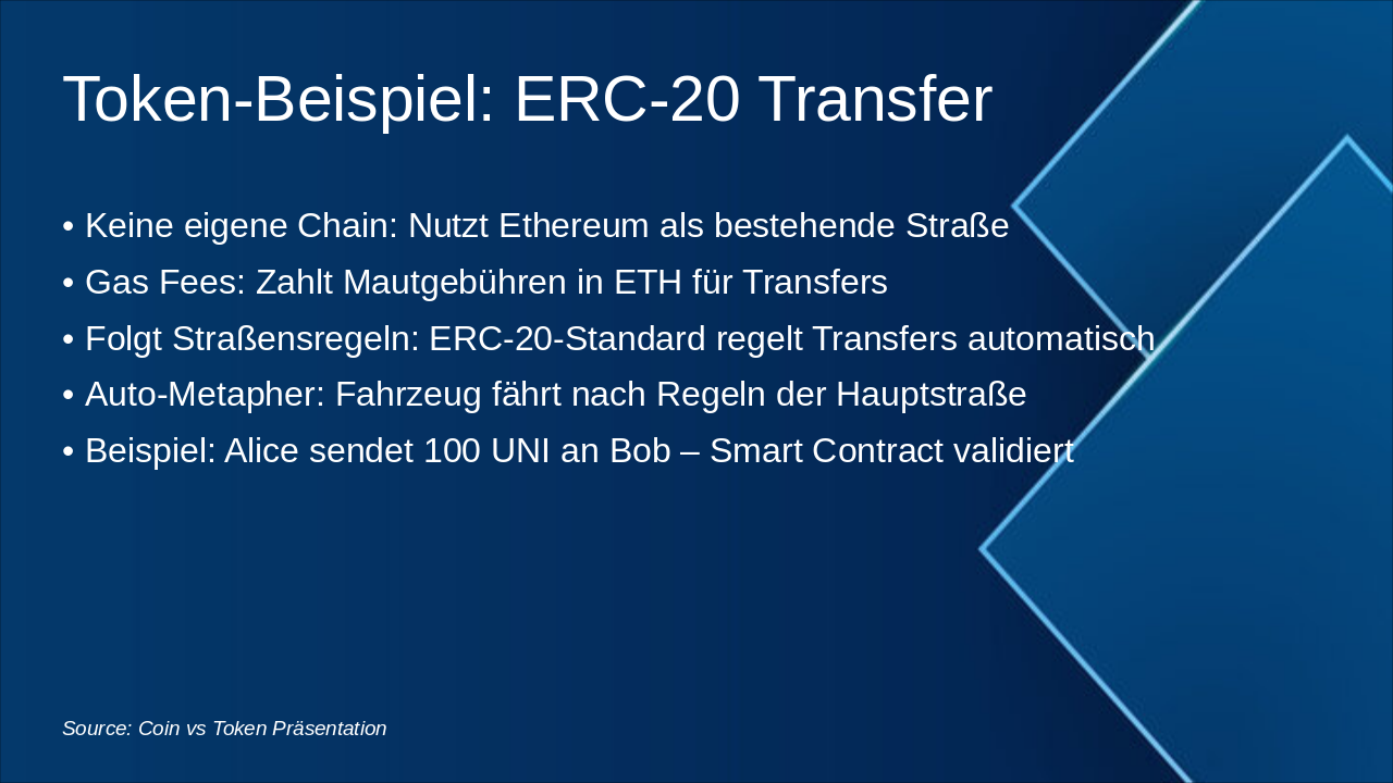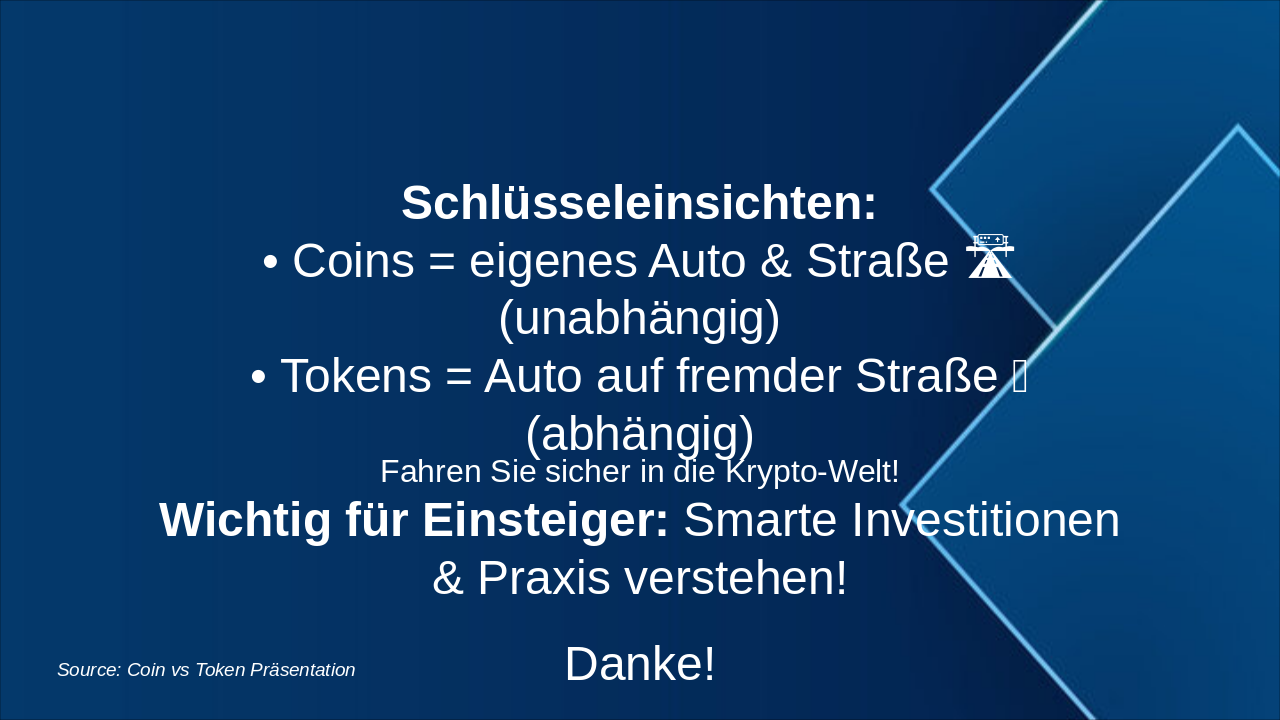 Anfängerfreundliche Canva-konforme Präsentation (max. 25 Folien) zum Thema „Coin vs Token“ mit der Auto-/Straßen-/Motor-Metapher.