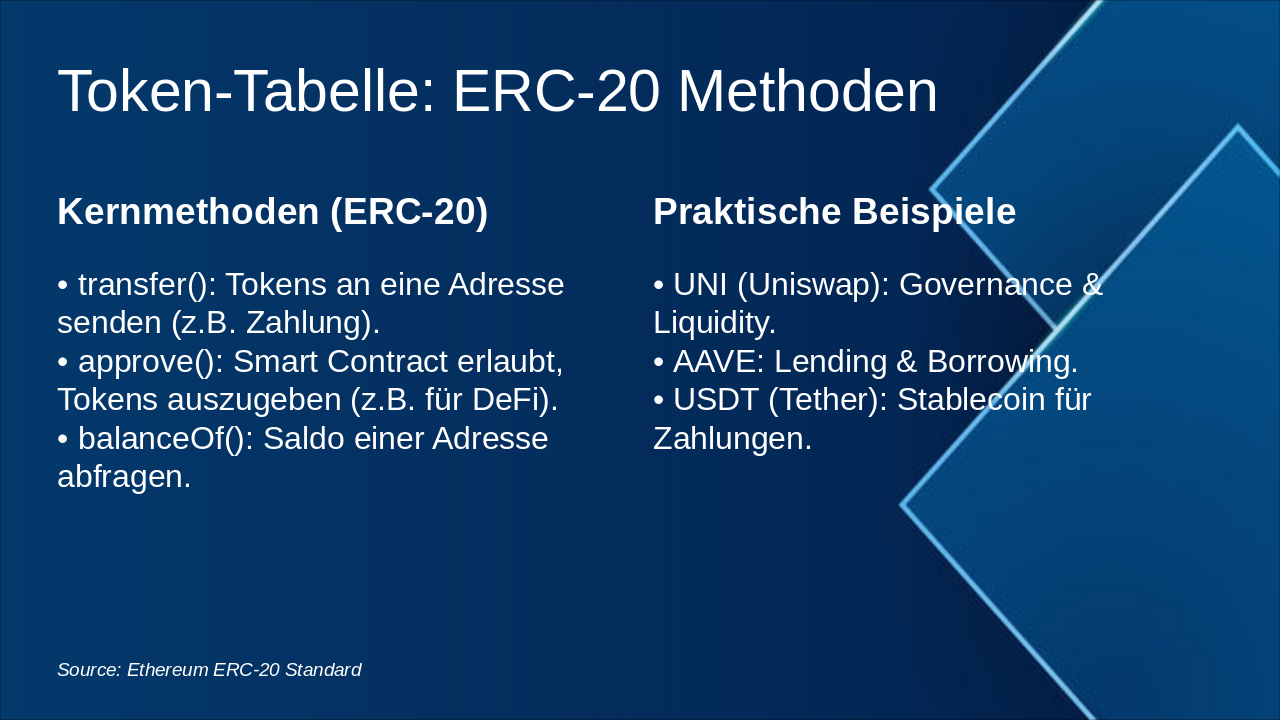 – Smart Contract, ERC-20 Standard, Token-Funktionen (transfer, approve, balance)
