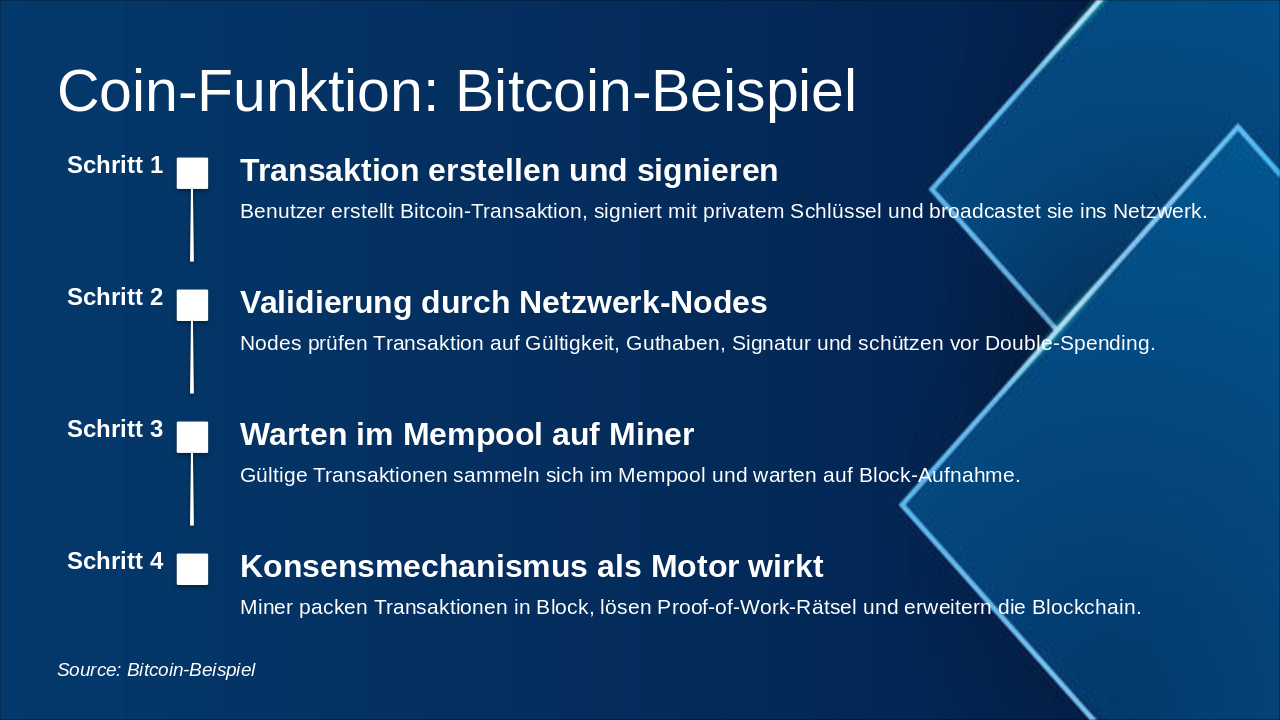 – Schritte: Konsensmechanismus wählen, Nodes implementieren, Blockchain aufbauen, Coin definieren