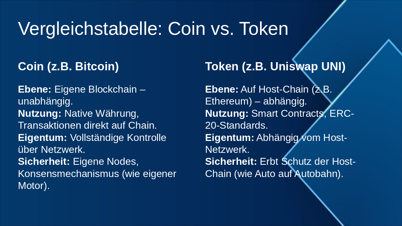 – Tabelle: Coin vs Token (Blockchain-Ebene, Nutzung, Eigentum, Sicherheit)