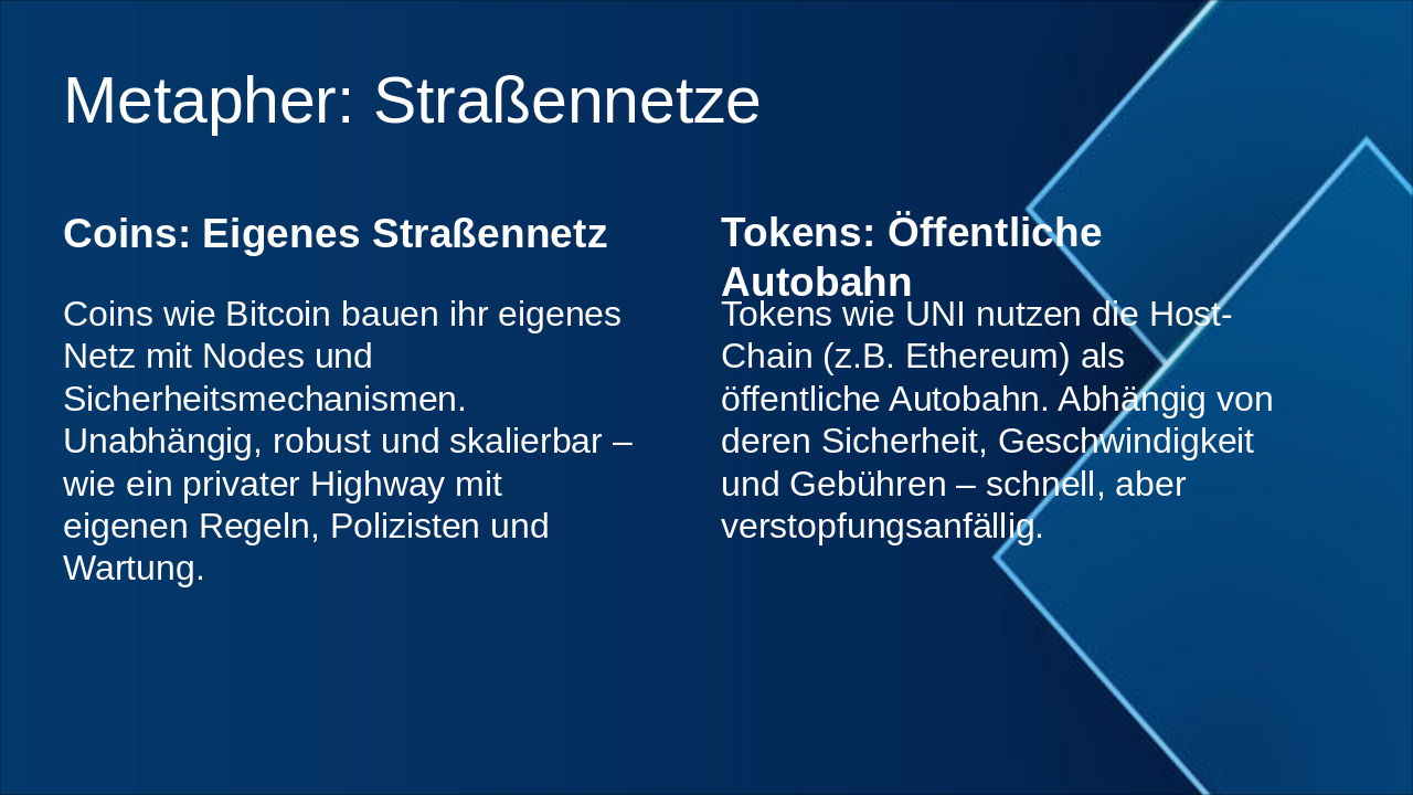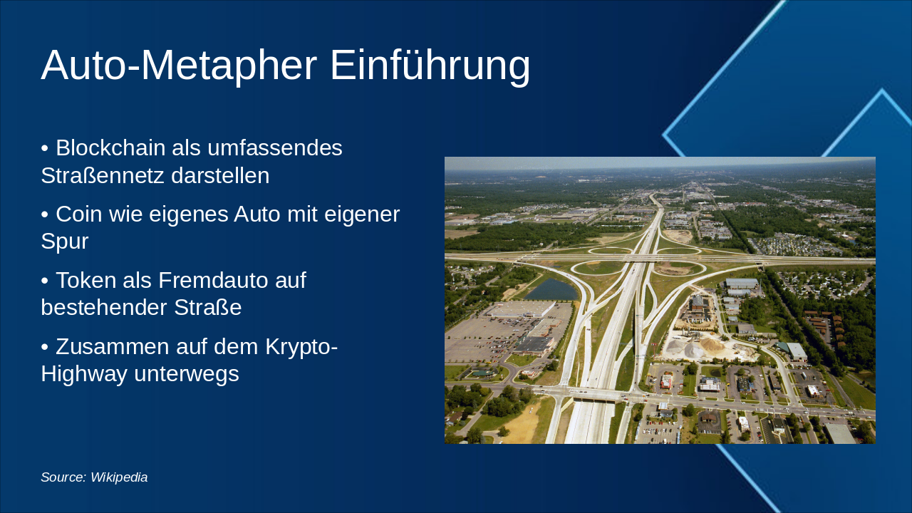 – Auto-Metapher: Blockchain als Straßennetz, Coin/Token als Fahrzeuge