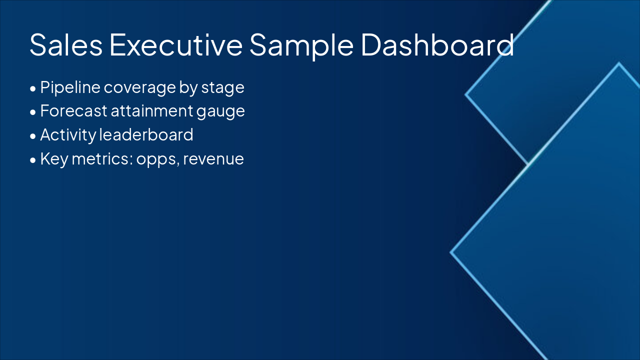 Pipeline stages, forecast gauge, activity leaderboard, inactive contacts.