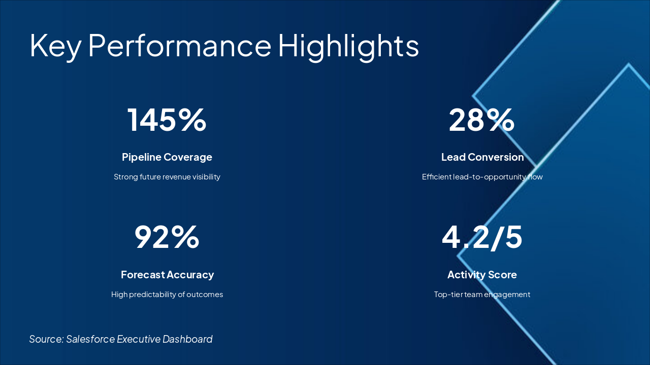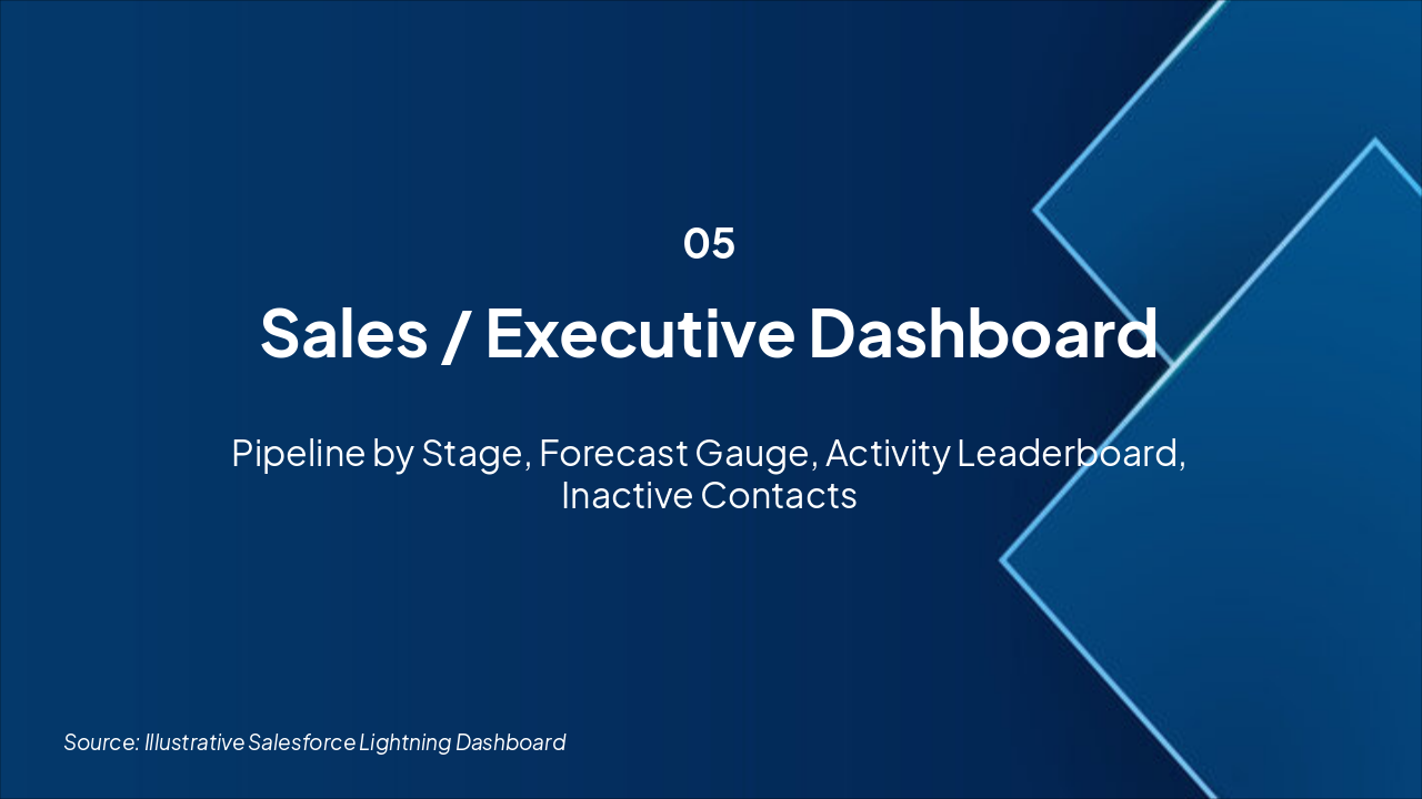 Outline of key sections for the updated Salesforce executive presentation, highlighting dashboard enhancements.