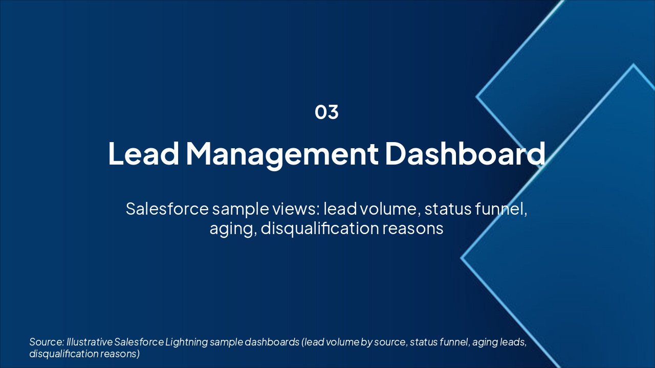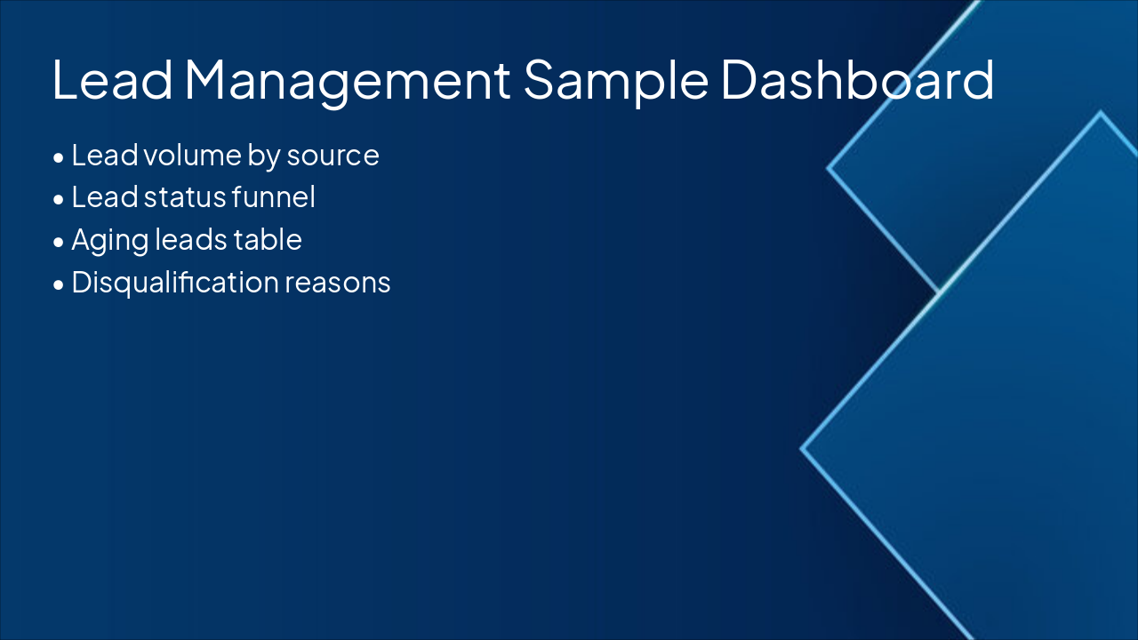 Key metrics: lead volume by source, status funnel, aging, disqualification reasons.