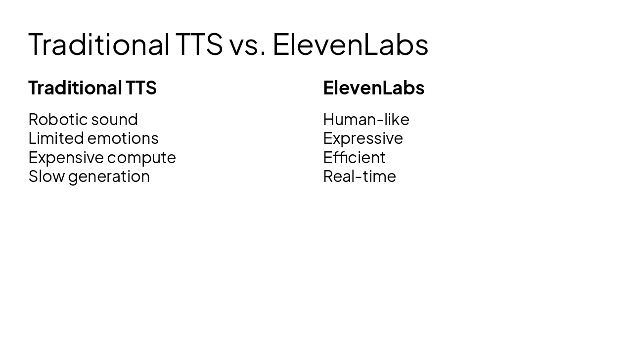 Traditional TTS Robotic sound Limited emotions Expensive compute Slow generation