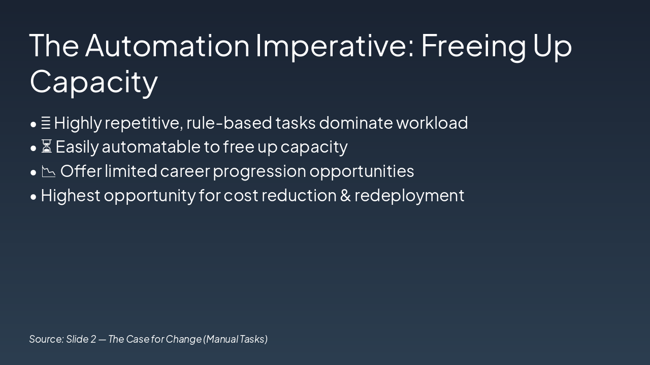 Rationale: Cost efficiency for high-volume, low-complexity tasks, aligned with risk and accountability. Talent: Manual→Automation Specialist→Project Lead | Analytical→Senior Analyst→Pod Lead | Judgmental→Oversight Lead→COE Governance Manager. Location: High-cost (🏙️): Senior Analysts; Low-cost (🌍️): Junior Analysts.
