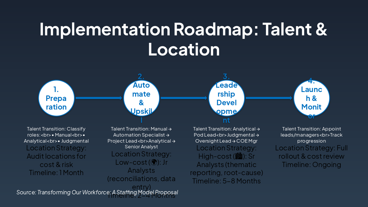 { "headers": [ "Phase", "Talent Transition", "Location Strategy", "Timeline" ], "rows": [ [ "1. Preparation", "Classify roles:<br>• Manual<br>• Analytical<br>• Judgmental", "Audit locations for cost & risk", "1 Month" ], [ "2. Automate & Upskill", "Manual → Automation Specialist → Project Lead<br>Analytical → Senior Analyst", "Low-cost (🌍️): Jr Analysts (reconciliations, data entry)", "2-4 Months" ], [ "3. Leadership Development", "Analytical → Pod Lead<br>Judgmental → Oversight Lead → COE Mgr", "High-cost (🏙️): Sr Analysts (thematic reporting, root-cause)", "5-8 Months" ], [ "4. Launch & Monitor", "Appoint leads/managers<br>Track progression", "Full rollout & cost review", "Ongoing" ] ] }